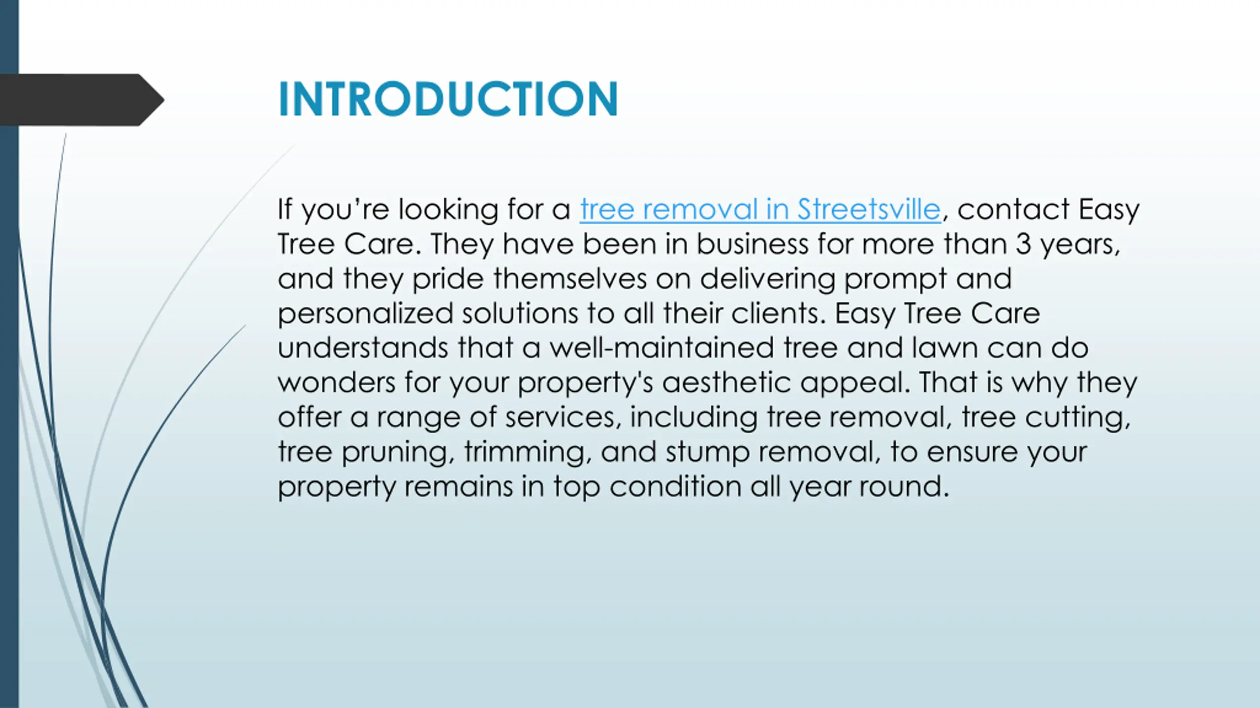 INTRODUCTION If you re looking for a tree removal in Streetsville, contact Easy Tree Care. They have been in business for more than 3 years, and they pride themselves on delivering prompt and personalized solutions to all their clients. Easy Tree Care understands that a well-maintained tree and lawn can do wonders for your property's aesthetic appeal. That is why they offer a range of services, including tree removal, tree cutting, tree pruning, trimming, and stump removal, to ensure your property remains in top condition all year round.