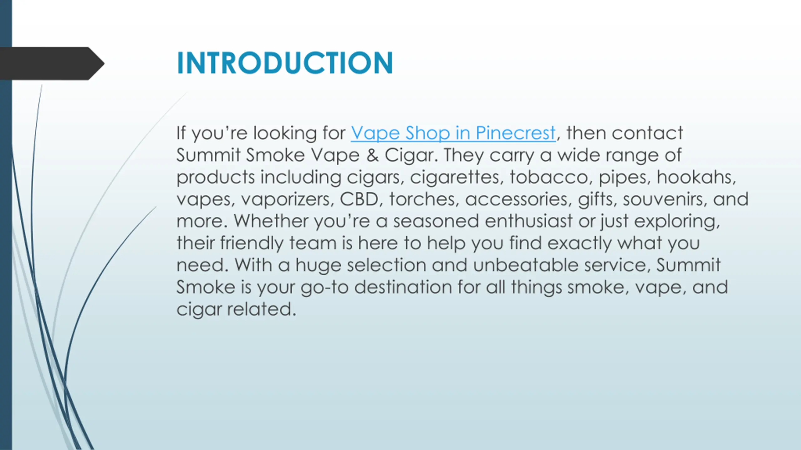 INTRODUCTION If you re looking for Vape Shop in Pinecrest, then contact Summit Smoke Vape & Cigar. They carry a wide range of products including cigars, cigarettes, tobacco, pipes, hookahs, vapes, vaporizers, CBD, torches, accessories, gifts, souvenirs, and more. Whether you re a seasoned enthusiast or just exploring, their friendly team is here to help you find exactly what you need. With a huge selection and unbeatable service, Summit Smoke is your go-to destination for all things smoke, vape, and cigar related.