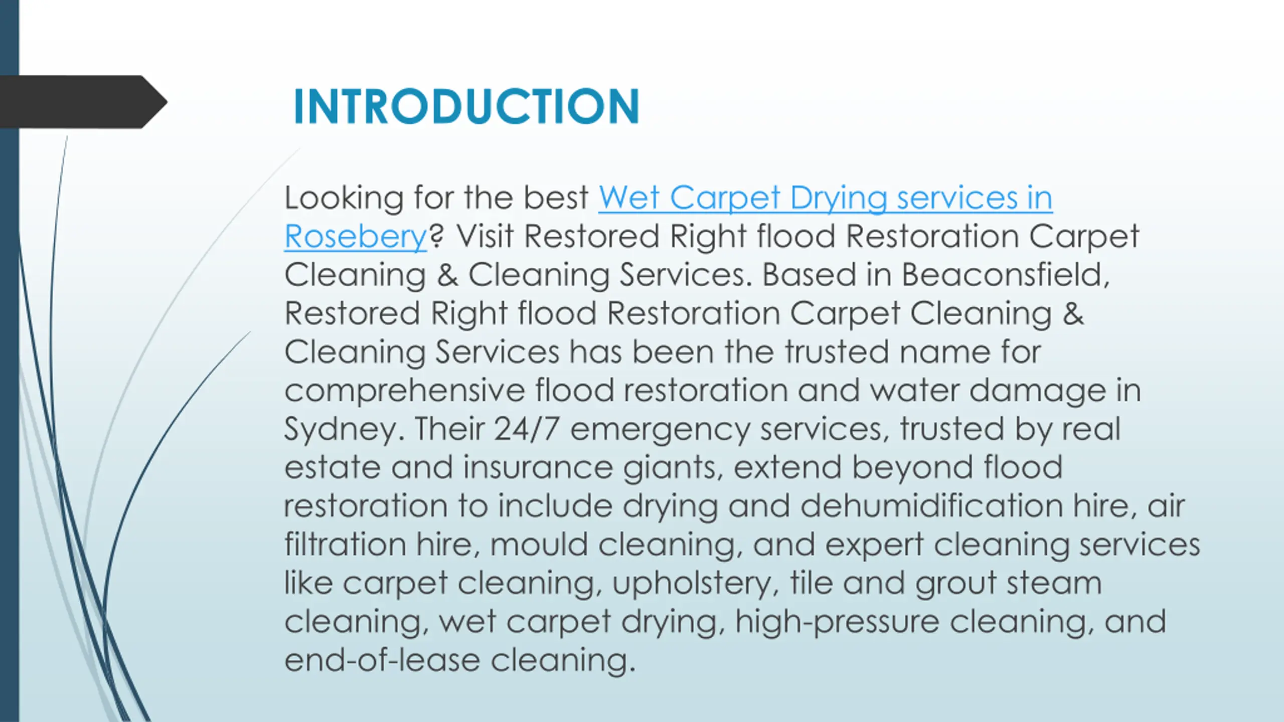 INTRODUCTION Looking for the best Wet Carpet Drying services in Rosebery? Visit Restored Right flood Restoration Carpet Cleaning & Cleaning Services. Based in Beaconsfield, Restored Right flood Restoration Carpet Cleaning & Cleaning Services has been the trusted name for comprehensive flood restoration and water damage in Sydney. Their 24/7 emergency services, trusted by real estate and insurance giants, extend beyond flood restoration to include drying and dehumidification hire, air filtration hire, mould cleaning, and expert cleaning services like carpet cleaning, upholstery, tile and grout steam cleaning, wet carpet drying, high-pressure cleaning, and end-of-lease cleaning.