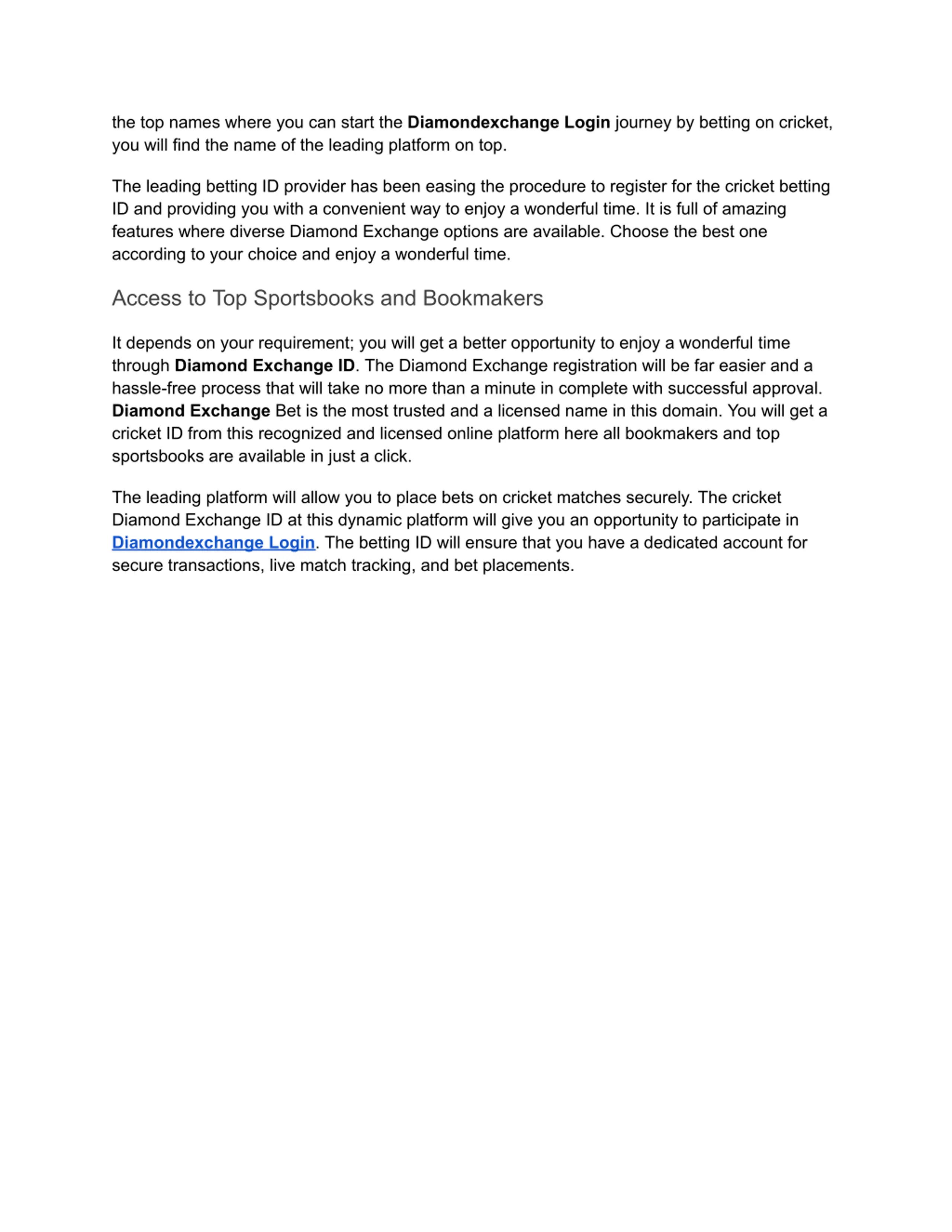 the top names where you can start the Diamondexchange Login journey by betting on cricket, you will find the name of the leading platform on top. The leading betting ID provider has been easing the procedure to register for the cricket betting ID and providing you with a convenient way to enjoy a wonderful time. It is full of amazing features where diverse Diamond Exchange options are available. Choose the best one according to your choice and enjoy a wonderful time. Access to Top Sportsbooks and Bookmakers It depends on your requirement; you will get a better opportunity to enjoy a wonderful time through Diamond Exchange ID. The Diamond Exchange registration will be far easier and a hassle-free process that will take no more than a minute in complete with successful approval. Diamond Exchange Bet is the most trusted and a licensed name in this domain. You will get a cricket ID from this recognized and licensed online platform here all bookmakers and top sportsbooks are available in just a click. The leading platform will allow you to place bets on cricket matches securely. The cricket Diamond Exchange ID at this dynamic platform will give you an opportunity to participate in Diamondexchange Login. The betting ID will ensure that you have a dedicated account for secure transactions, live match tracking, and bet placements.
