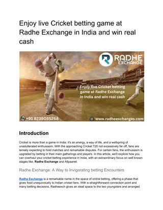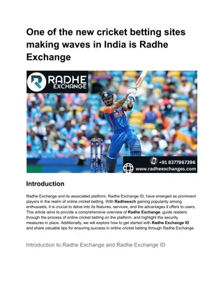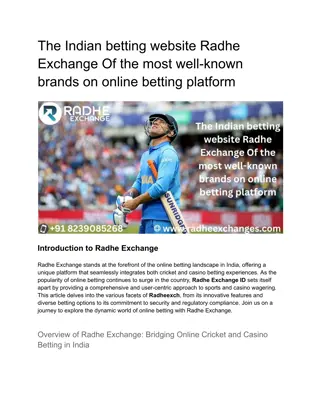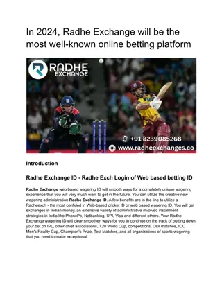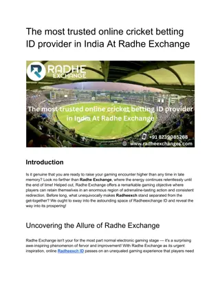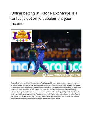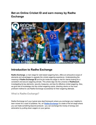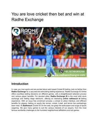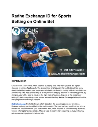 Bet Online on Cricket at Radhe Exchange in India About Internet based Cricket ID Supplier Could it be said that you are prepared to lift your cricket being a fan to a higher level? Look no further! Presenting Radhe Exchange, your chief objective for everything cricket betting. At (disguised data), we're committed to presenting to you the most exciting and vivid betting experience customized explicitly for cricket fans like you. Why pick Radhe Exchange? This separates us: Unrivaled Assortment: Whether you love Test matches, One Day Internationals, T20s, or even the high speed fervor of the IPL, we take care of you. Investigate a huge swath of betting choices across different cricket associations and competitions from around the globe.