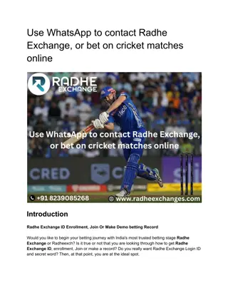 State of the art Innovation: Our foundation is planned in view of client experience. Appreciate consistent route, lightning-quick updates, and secure Radheexch, all readily available. With our instinctive connection point, putting down wagers has never been simpler. Master Experiences: Remain on the ball with our master investigation and forecasts. Access important bits of knowledge, insights, and tips from prepared cricket examiners to illuminate your betting choices and expand your odds of coming out on top. Free from even a hint of harm: Your wellbeing is our first concern. Have confidence that your own data and Radhe Exchange ID are safeguarded by cutting edge safety efforts, guaranteeing a straightforward betting experience without fail. all day, every day Backing: Have an inquiry or need help? Our devoted client care group is accessible nonstop to address any worries and give help at whatever point you really want it. Join the large number of cricket fans who trust Radhe Exchange for their betting needs. Join today at (disguised data) and experience the adventure of cricket betting more than ever! Keep in mind, with regards to cricket betting, Radhe Exchange is your final location. Try not to pass up the activity - put down your wagers with certainty and let the games start! Consider all cricket lovers and betting fans! Is it true or not that you are prepared to raise your cricket watching experience to a higher level? Look no farther than Radhe Exchange - your final location for first class web-based cricket betting. At Radhe Exchange, we value being the main betting stage on (covered data). With a consistent UI, secure exchanges, and a broad cluster of betting choices, we guarantee that each second spent on our foundation is loaded up with fervor and expectation. Why pick Radhe Exchange? Extensive variety of Business sectors: Whether it's global matches, homegrown associations, or T20 spectacles, we take care of you. With plenty of betting markets accessible, including match-victor, top batsman, top bowler, and that's just the beginning, there will never be a dull second at Radheexch. Cutthroat Chances: We comprehend the significance of getting the best incentive for your wagers. That is the reason we offer cutthroat chances across the entirety of our business sectors, guaranteeing that you augment your expected returns. Live betting: Experience the excitement of continuous betting with our live betting highlight. Put down your wagers as the activity unfurls, and watch your rewards develop with each limit and wicket.