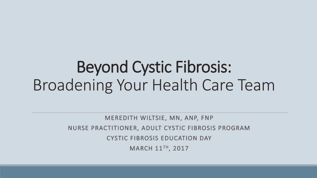 Beyond Cystic Fibrosis: Beyond Cystic Fibrosis: Broadening Your Health Care Team MEREDITH WILTSIE, MN, ANP, FNP MEREDITH WILTSIE, MN, ANP, FNP NURSE PRACTITIONER, ADULT CYSTIC FIBROSIS PROGRAM NURSE PRACTITIONER, ADULT CYSTIC FIBROSIS PROGRAM CYSTIC FIBROSIS EDUCATION DAY CYSTIC FIBROSIS EDUCATION DAY MARCH 11TH TH, 2017 , 2017 MARCH 11