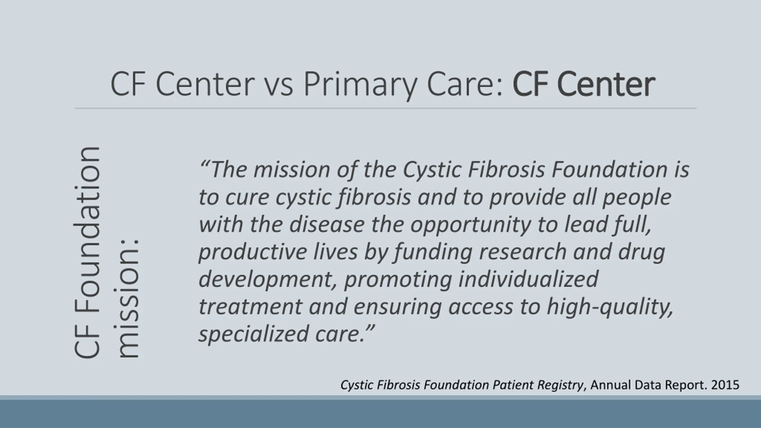 CF Center vs Primary Care: CF Center CF Center CF Foundation The mission of the Cystic Fibrosis Foundation is to cure cystic fibrosis and to provide all people with the disease the opportunity to lead full, productive lives by funding research and drug development, promoting individualized treatment and ensuring access to high-quality, specialized care. mission: Cystic Fibrosis Foundation Patient Registry, Annual Data Report. 2015