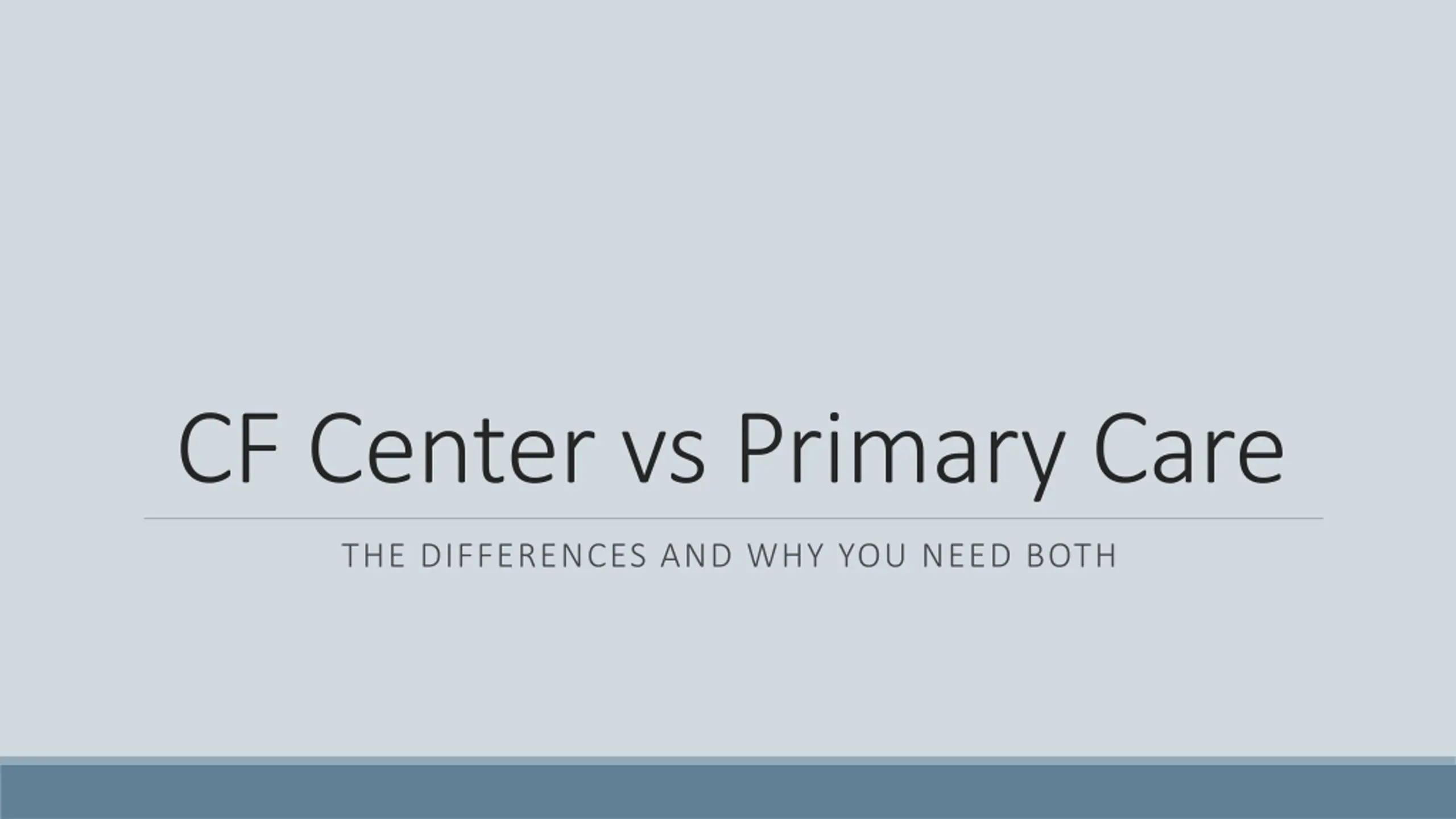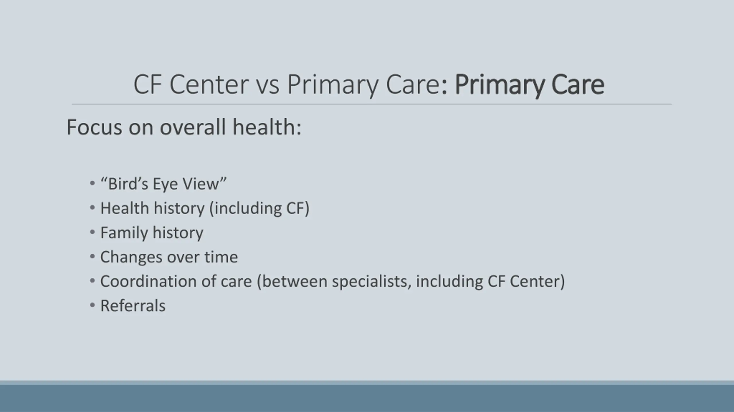 CF Center vs Primary Care: Primary Care : Primary Care Focus on overall health: Bird s Eye View Health history (including CF) Family history Changes over time Coordination of care (between specialists, including CF Center) Referrals