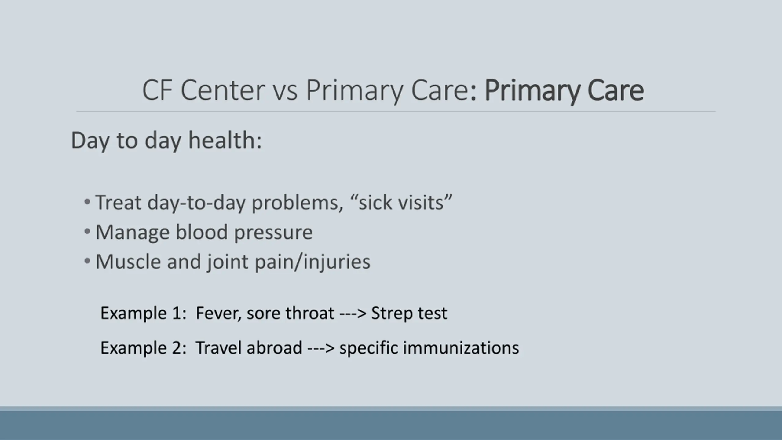 CF Center vs Primary Care: Primary Care : Primary Care Day to day health: Treat day-to-day problems, sick visits Manage blood pressure Muscle and joint pain/injuries Example 1: Fever, sore throat ---> Strep test Example 2: Travel abroad ---> specific immunizations
