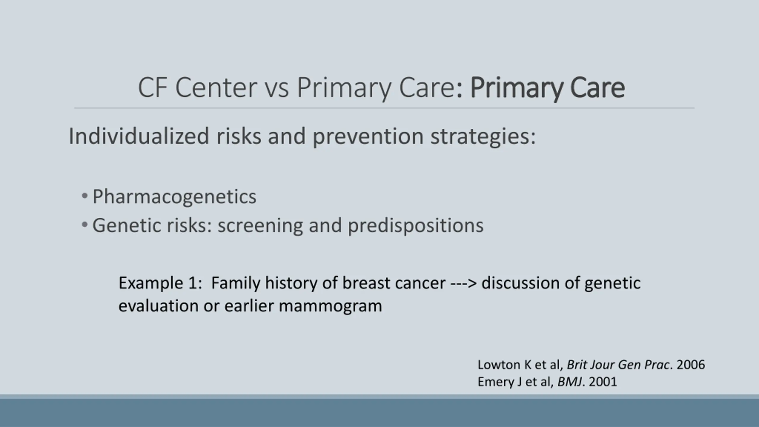CF Center vs Primary Care: Primary Care : Primary Care Individualized risks and prevention strategies: Pharmacogenetics Genetic risks: screening and predispositions Example 1: Family history of breast cancer ---> discussion of genetic evaluation or earlier mammogram Lowton K et al, Brit Jour Gen Prac. 2006 Emery J et al, BMJ. 2001