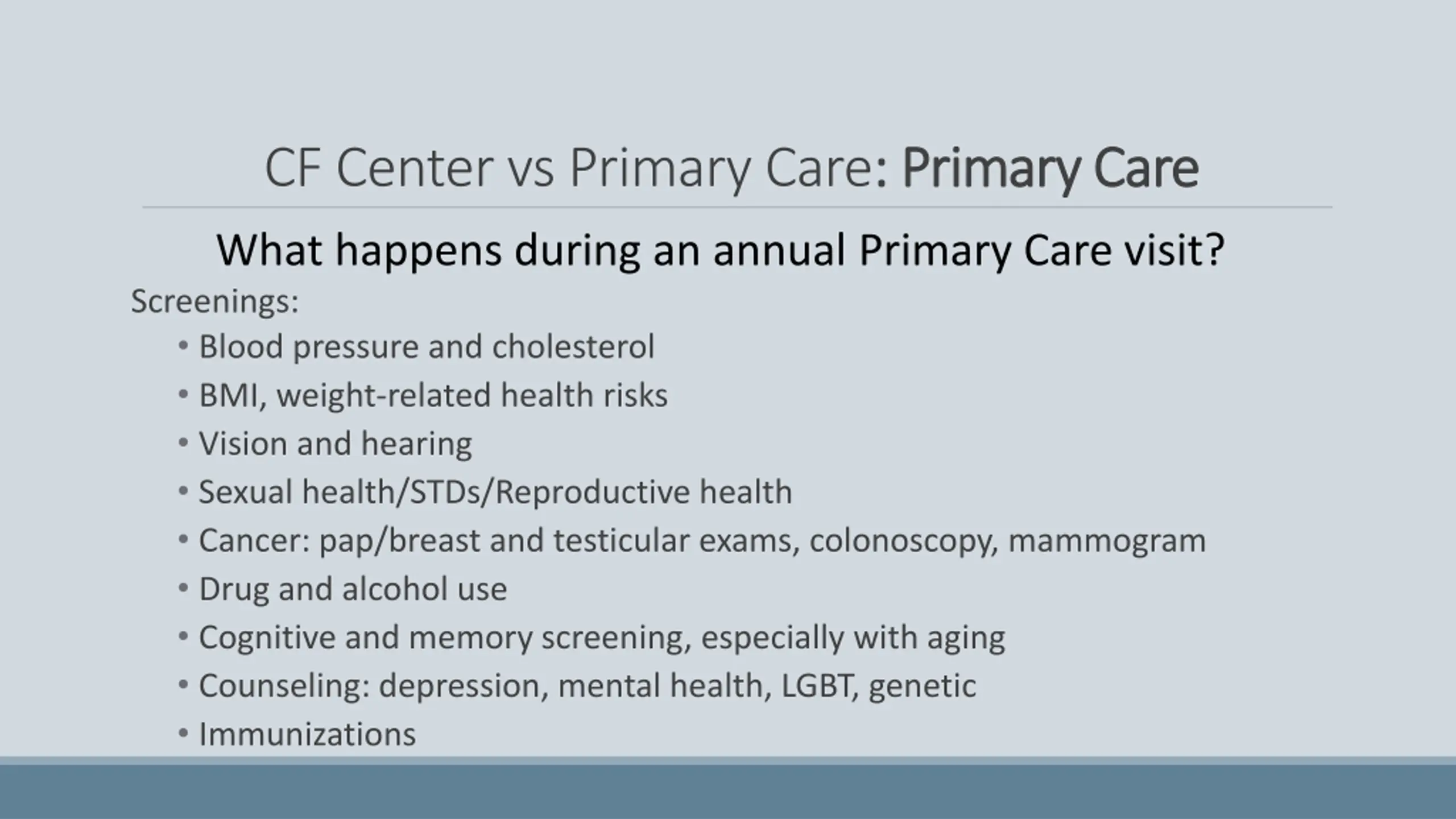 CF Center vs Primary Care: Primary Care : Primary Care What happens during an annual Primary Care visit? Screenings: Blood pressure and cholesterol BMI, weight-related health risks Vision and hearing Sexual health/STDs/Reproductive health Cancer: pap/breast and testicular exams, colonoscopy, mammogram Drug and alcohol use Cognitive and memory screening, especially with aging Counseling: depression, mental health, LGBT, genetic Immunizations