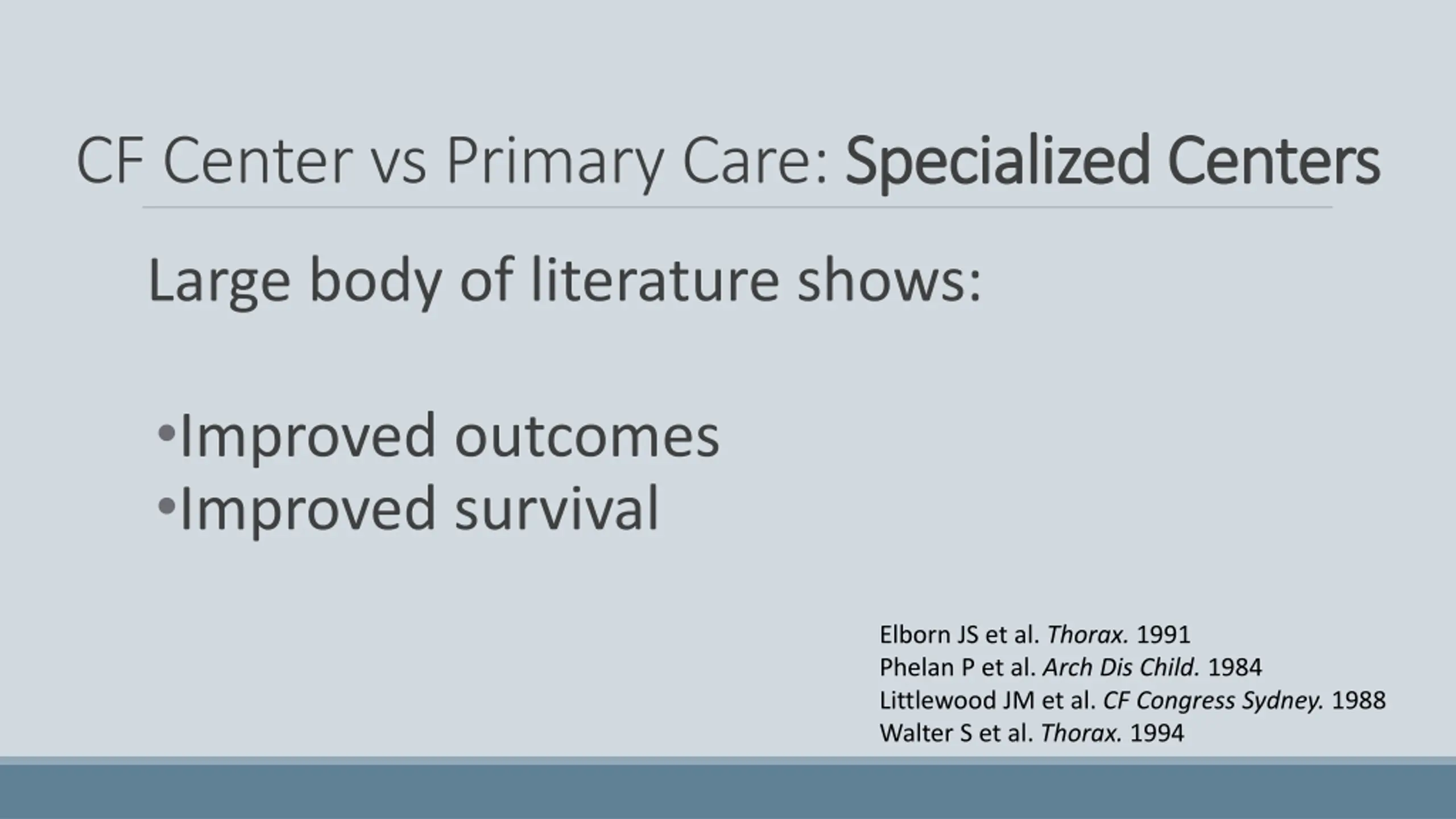 CF Center vs Primary Care: Specialized Centers Specialized Centers Large body of literature shows: Improved outcomes Improved survival Elborn JS et al. Thorax. 1991 Phelan P et al. Arch Dis Child. 1984 Littlewood JM et al. CF Congress Sydney. 1988 Walter S et al. Thorax. 1994