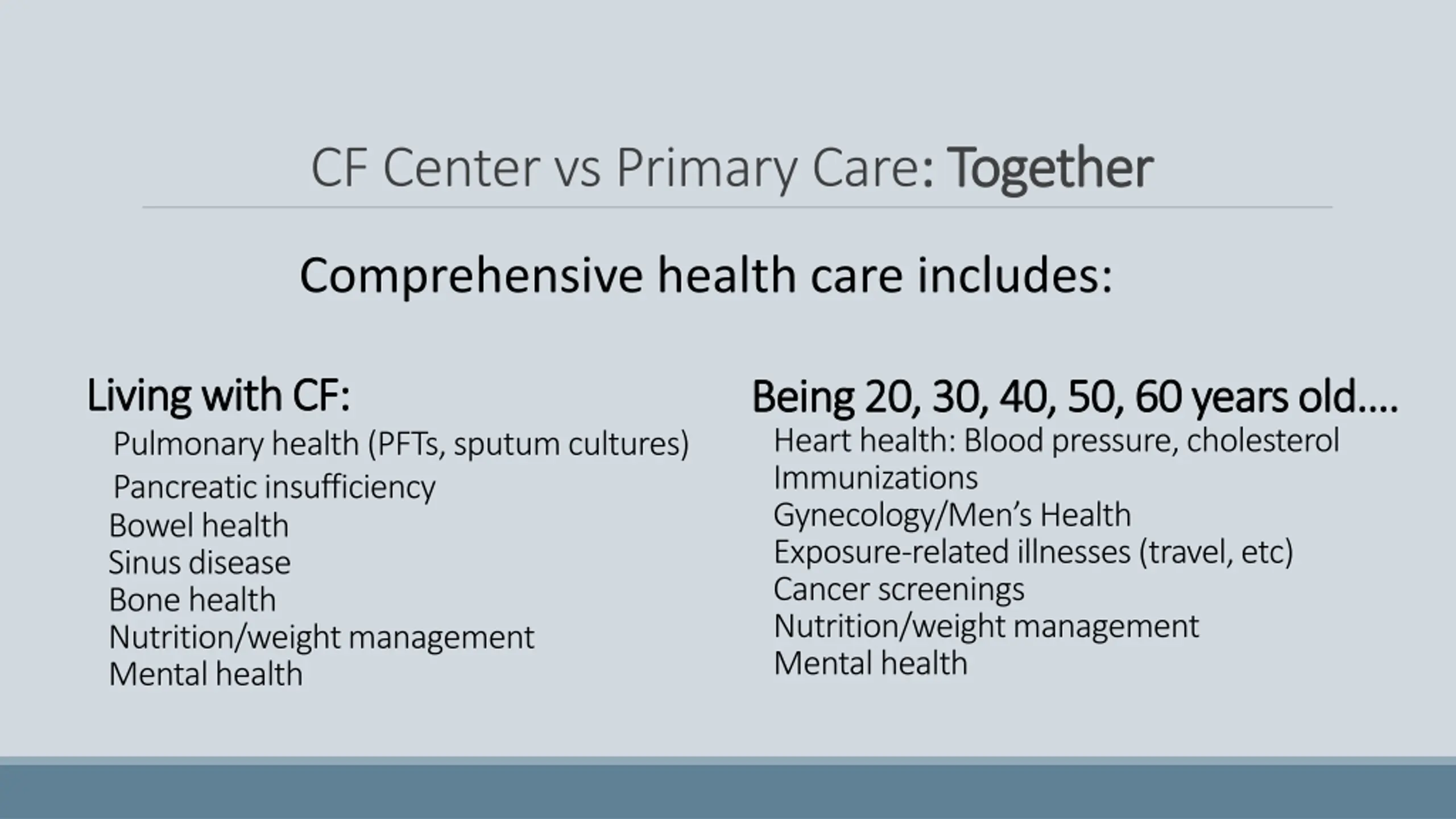 CF Center vs Primary Care: Together : Together Comprehensive health care includes: Living with CF: Living with CF: Pulmonary health (PFTs, sputum cultures) Pancreatic insufficiency Bowel health Sinus disease Bone health Nutrition/weight management Mental health Being 20, 30, 40, 50, 60 years old Being 20, 30, 40, 50, 60 years old . . Heart health: Blood pressure, cholesterol Immunizations Gynecology/Men s Health Exposure-related illnesses (travel, etc) Cancer screenings Nutrition/weight management Mental health