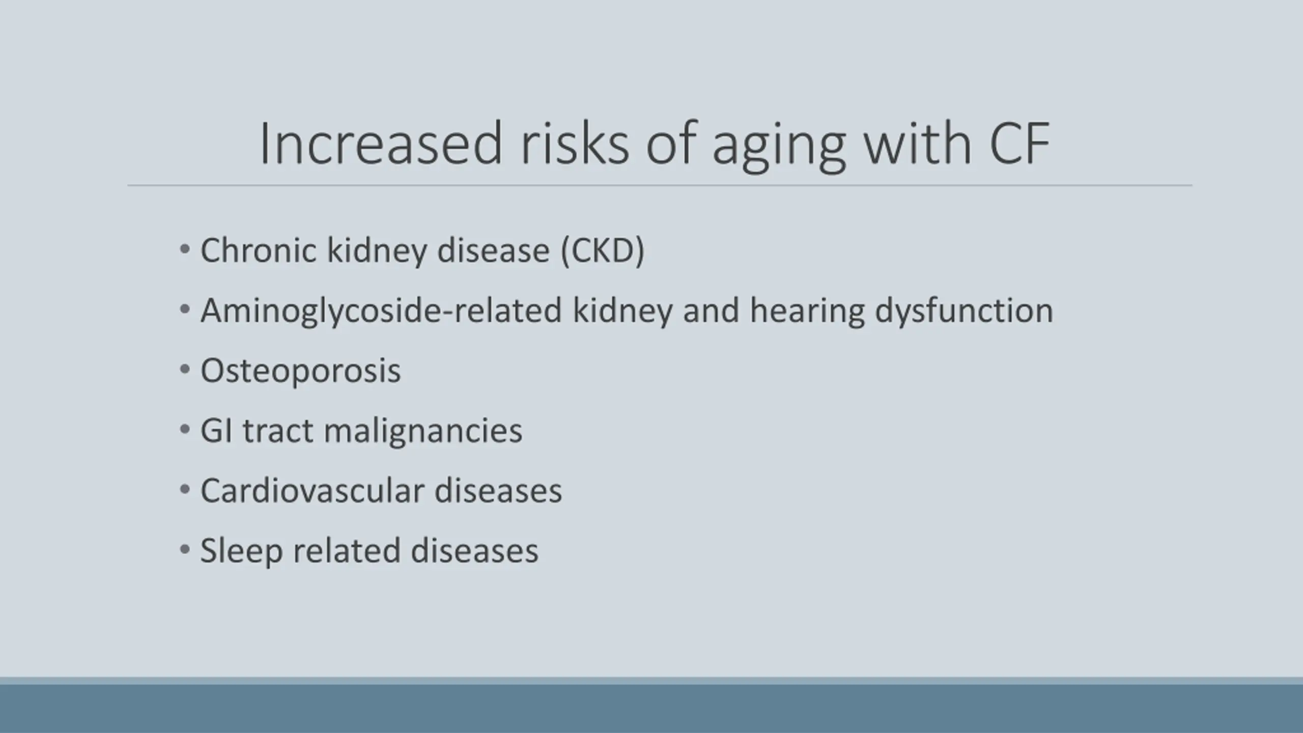 Increased risks of aging with CF Chronic kidney disease (CKD) Aminoglycoside-related kidney and hearing dysfunction Osteoporosis GI tract malignancies Cardiovascular diseases Sleep related diseases