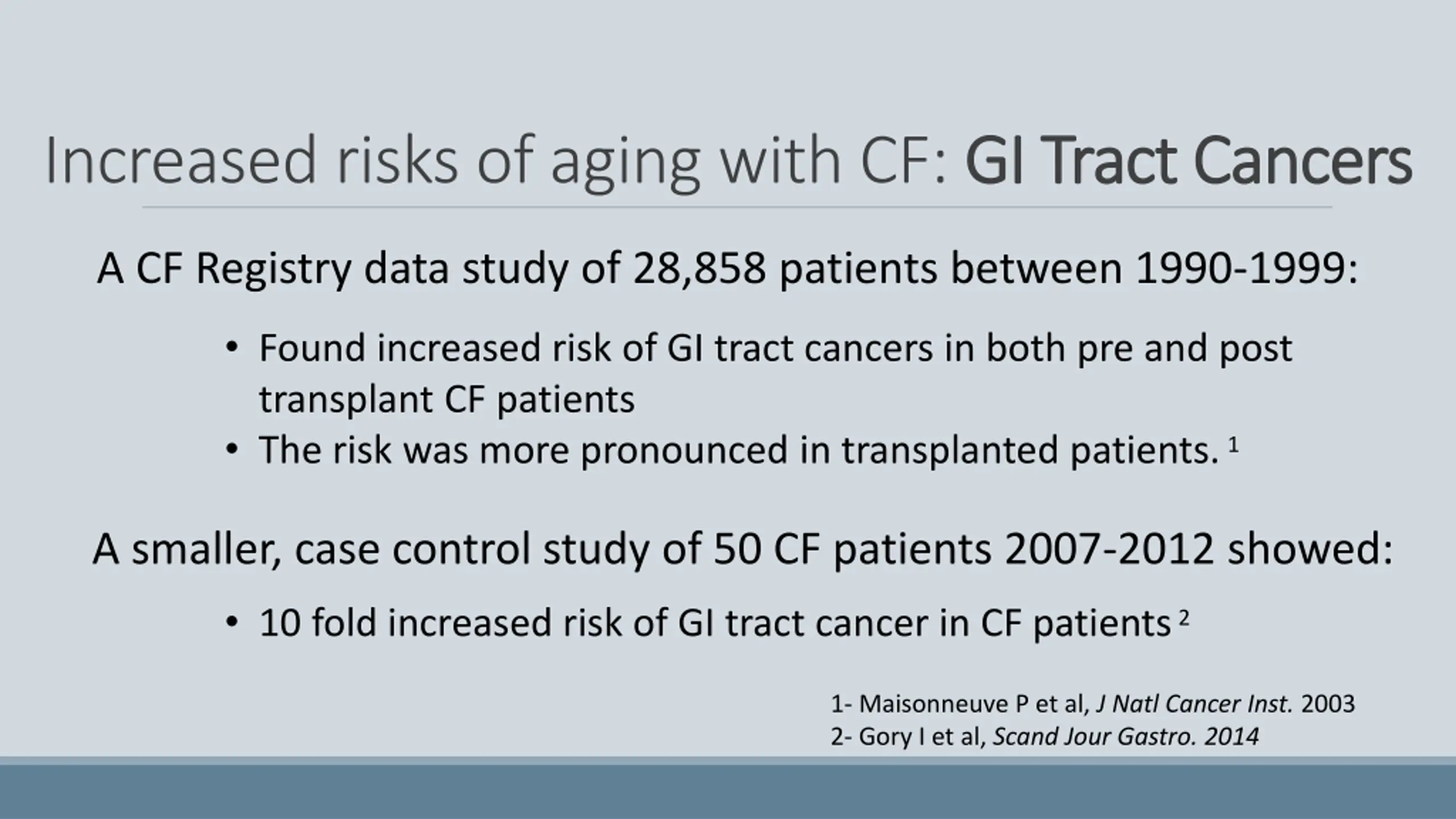 Increased risks of aging with CF: GI Tract Cancers GI Tract Cancers A CF Registry data study of 28,858 patients between 1990-1999: Found increased risk of GI tract cancers in both pre and post transplant CF patients The risk was more pronounced in transplanted patients.1 A smaller, case control study of 50 CF patients 2007-2012 showed: 10 fold increased risk of GI tract cancer in CF patients 2 1- Maisonneuve P et al, J Natl Cancer Inst. 2003 2- Gory I et al, Scand Jour Gastro. 2014
