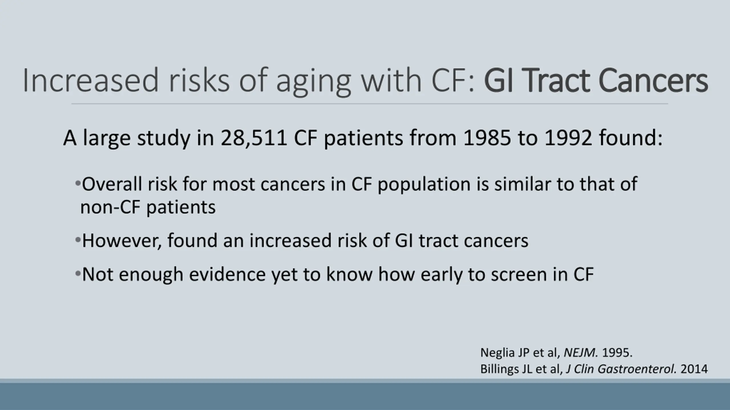 Increased risks of aging with CF: GI Tract Cancers GI Tract Cancers A large study in 28,511 CF patients from 1985 to 1992 found: Overall risk for most cancers in CF population is similar to that of non-CF patients However, found an increased risk of GI tract cancers Not enough evidence yet to know how early to screen in CF Neglia JP et al, NEJM. 1995. Billings JL et al, J Clin Gastroenterol. 2014
