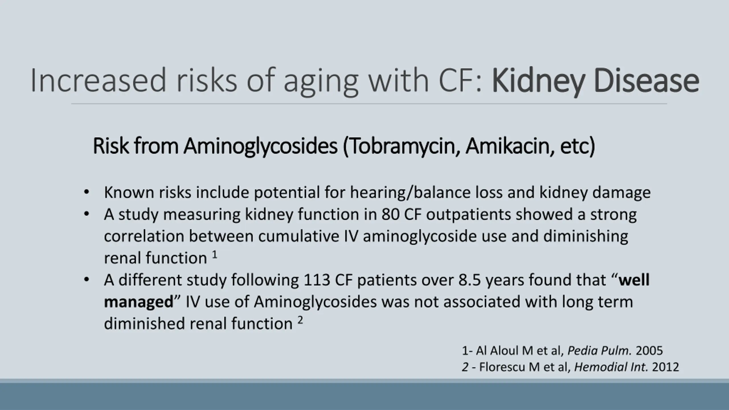 Increased risks of aging with CF: Kidney Disease Kidney Disease Risk from Aminoglycosides (Tobramycin, Amikacin, Risk from Aminoglycosides (Tobramycin, Amikacin, etc etc) ) Known risks include potential for hearing/balance loss and kidney damage A study measuring kidney function in 80 CF outpatients showed a strong correlation between cumulative IV aminoglycoside use and diminishing renal function 1 A different study following 113 CF patients over 8.5 years found that well managed IV use of Aminoglycosides was not associated with long term diminished renal function 2 1- Al Aloul M et al, Pedia Pulm. 2005 2 - Florescu M et al, Hemodial Int. 2012