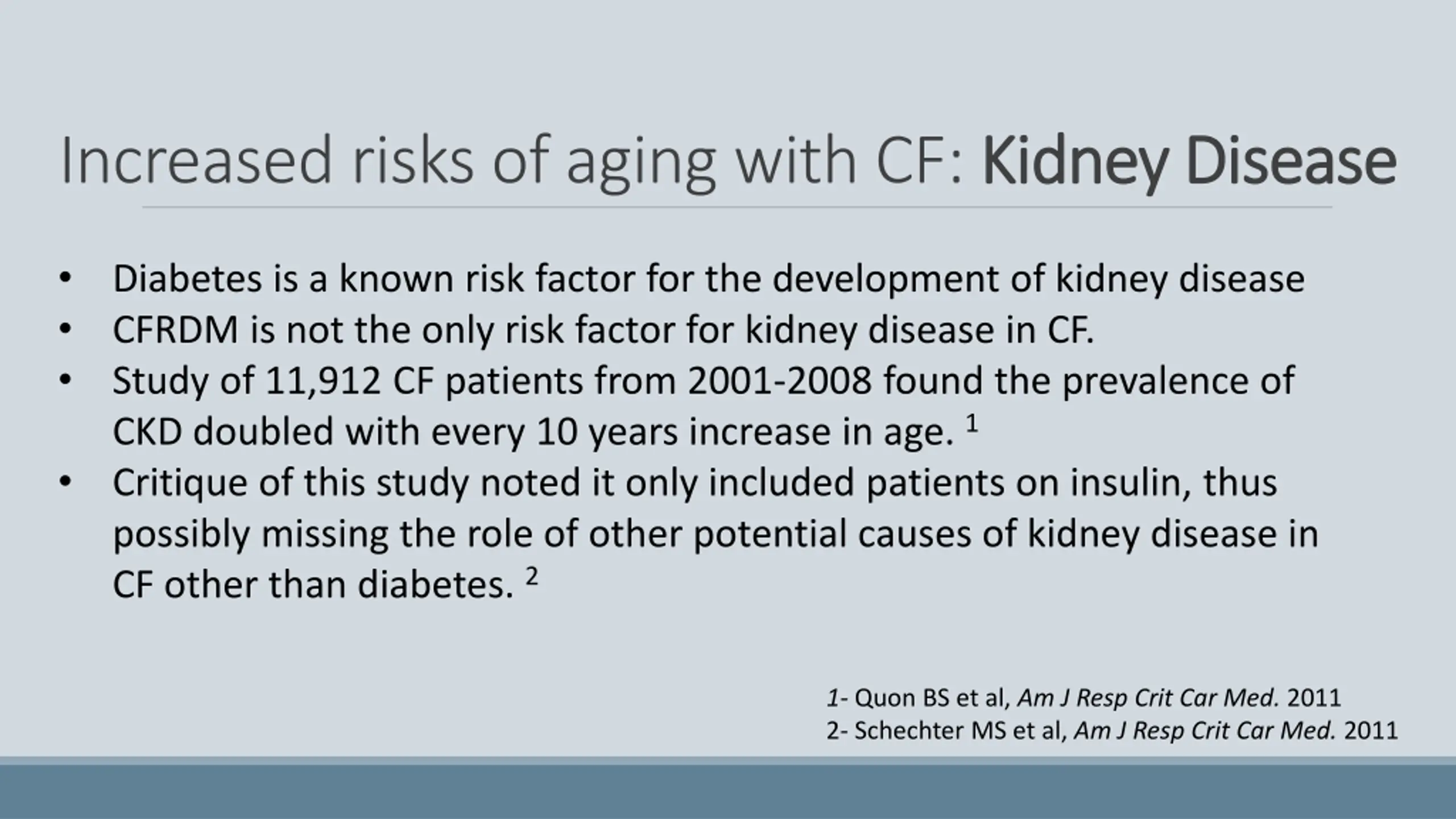 Increased risks of aging with CF: Kidney Disease Kidney Disease Diabetes is a known risk factor for the development of kidney disease CFRDM is not the only risk factor for kidney disease in CF. Study of 11,912 CF patients from 2001-2008 found the prevalence of CKD doubled with every 10 years increase in age. 1 Critique of this study noted it only included patients on insulin, thus possibly missing the role of other potential causes of kidney disease in CF other than diabetes. 2 1- Quon BS et al, Am J Resp Crit Car Med. 2011 2- Schechter MS et al, Am J Resp Crit Car Med. 2011