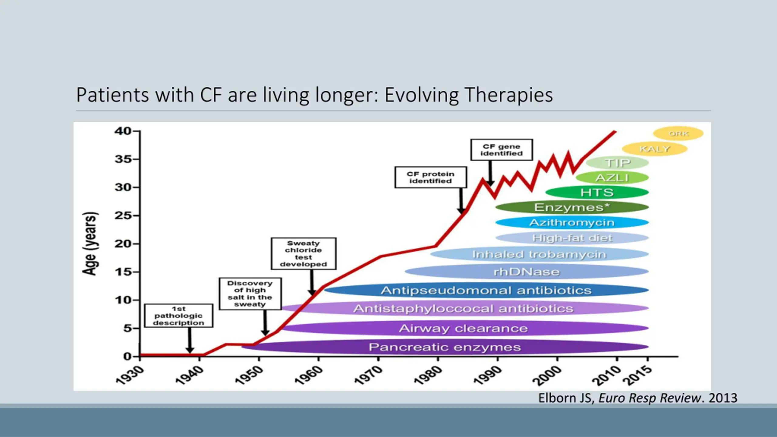 Patients with CF are living longer: Evolving Therapies Elborn JS, Euro Resp Review. 2013