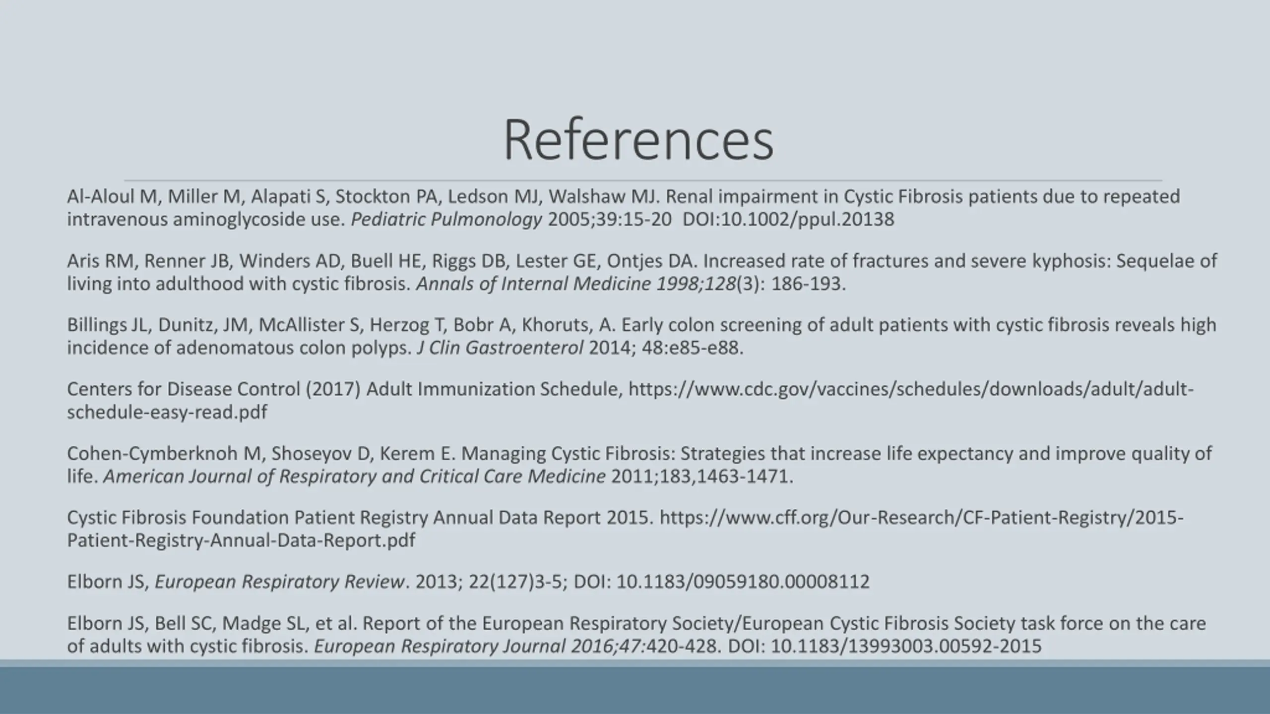 References Al-Aloul M, Miller M, Alapati S, Stockton PA, Ledson MJ, Walshaw MJ. Renal impairment in Cystic Fibrosis patients due to repeated intravenous aminoglycoside use. Pediatric Pulmonology 2005;39:15-20 DOI:10.1002/ppul.20138 Aris RM, Renner JB, Winders AD, Buell HE, Riggs DB, Lester GE, Ontjes DA. Increased rate of fractures and severe kyphosis: Sequelae of living into adulthood with cystic fibrosis. Annals of Internal Medicine 1998;128(3): 186-193. Billings JL, Dunitz, JM, McAllister S, Herzog T, Bobr A, Khoruts, A. Early colon screening of adult patients with cystic fibrosis reveals high incidence of adenomatous colon polyps. J ClinGastroenterol 2014; 48:e85-e88. Centers for Disease Control (2017) Adult Immunization Schedule, https://www.cdc.gov/vaccines/schedules/downloads/adult/adult- schedule-easy-read.pdf Cohen-Cymberknoh M, Shoseyov D, Kerem E. Managing Cystic Fibrosis: Strategies that increase life expectancy and improve quality of life. American Journal of Respiratory and Critical Care Medicine 2011;183,1463-1471. Cystic Fibrosis Foundation Patient Registry Annual Data Report 2015. https://www.cff.org/Our-Research/CF-Patient-Registry/2015- Patient-Registry-Annual-Data-Report.pdf Elborn JS, European Respiratory Review. 2013; 22(127)3-5; DOI: 10.1183/09059180.00008112 Elborn JS, Bell SC, Madge SL, et al. Report of the European Respiratory Society/European Cystic Fibrosis Society task force on the care of adults with cystic fibrosis. European Respiratory Journal 2016;47:420-428. DOI: 10.1183/13993003.00592-2015