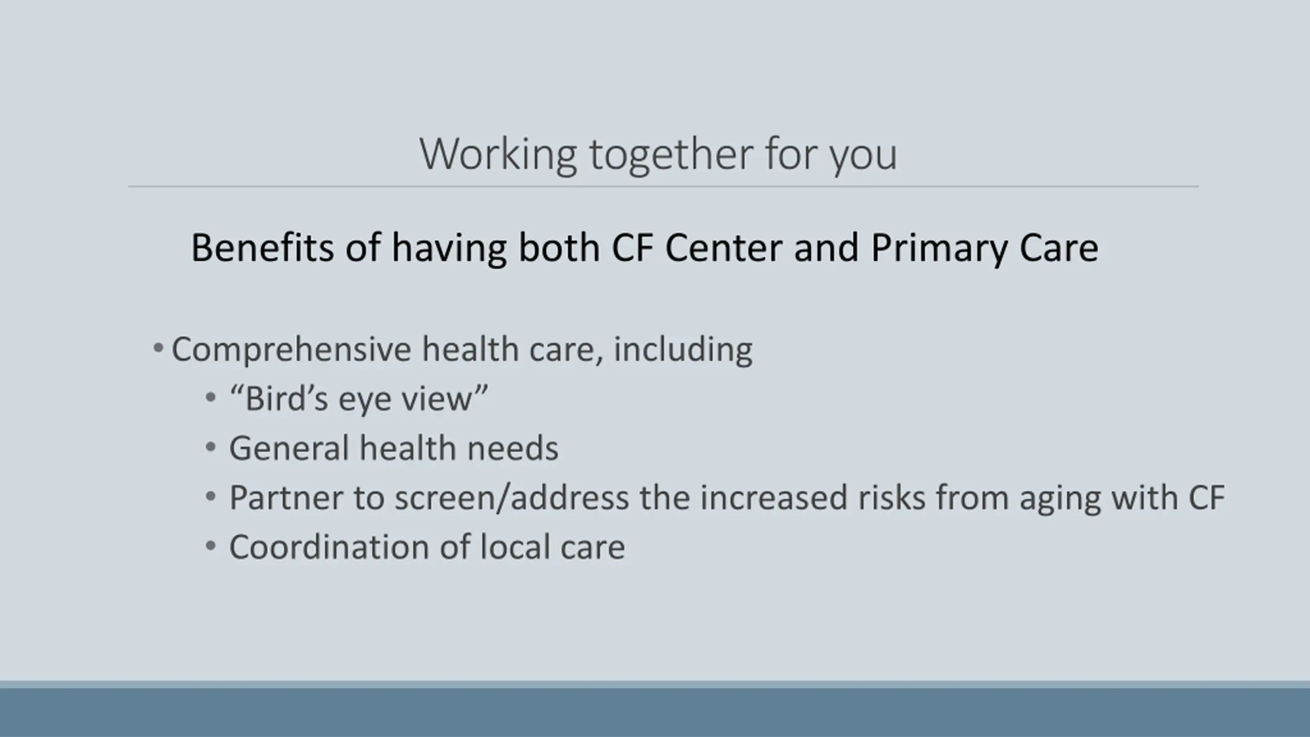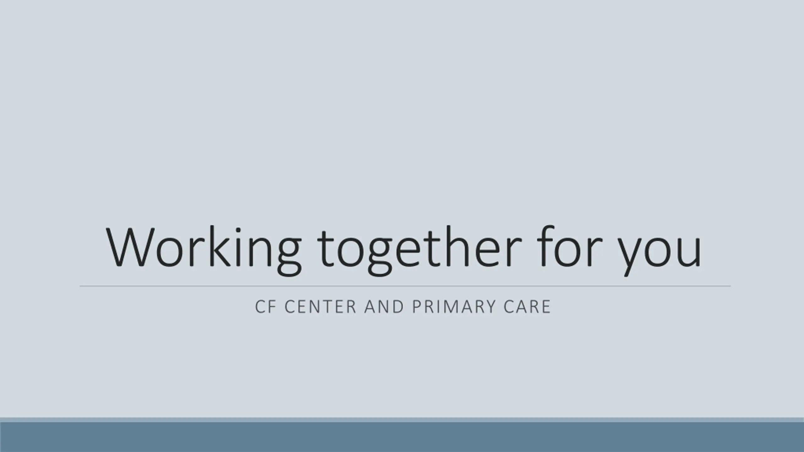 Working together for you Benefits of having both CF Center and Primary Care Comprehensive health care, including Bird s eye view General health needs Partner to screen/address the increased risks from aging with CF Coordination of local care