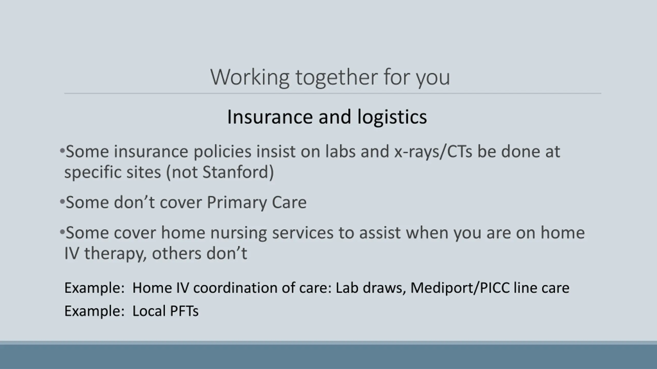 Working together for you Insurance and logistics Some insurance policies insist on labs and x-rays/CTs be done at specific sites (not Stanford) Some don t cover Primary Care Some cover home nursing services to assist when you are on home IV therapy, others don t Example: Home IV coordination of care: Lab draws, Mediport/PICC line care Example: Local PFTs