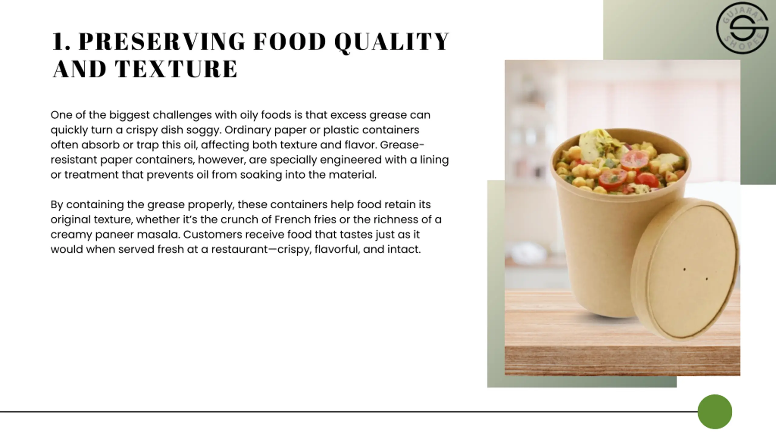 1. PRESERVING FOOD QUALITY AND TEXTURE One of the biggest challenges with oily foods is that excess grease can quickly turn a crispy dish soggy. Ordinary paper or plastic containers often absorb or trap this oil, affecting both texture and flavor. Grease- resistant paper containers, however, are specially engineered with a lining or treatment that prevents oil from soaking into the material. By containing the grease properly, these containers help food retain its original texture, whether it s the crunch of French fries or the richness of a creamy paneer masala. Customers receive food that tastes just as it would when served fresh at a restaurant crispy, flavorful, and intact.