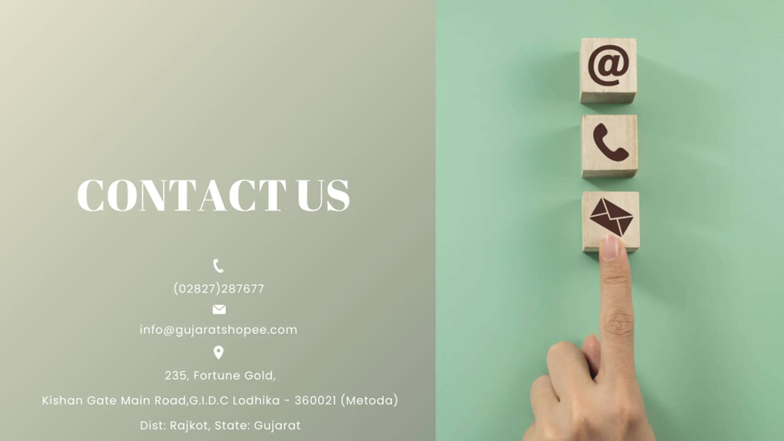 CONTACT US (02827)287677 info@gujaratshopee.com 235, Fortune Gold, Kishan Gate Main Road,G.I.D.C Lodhika - 360021 (Metoda) Dist: Rajkot, State: Gujarat