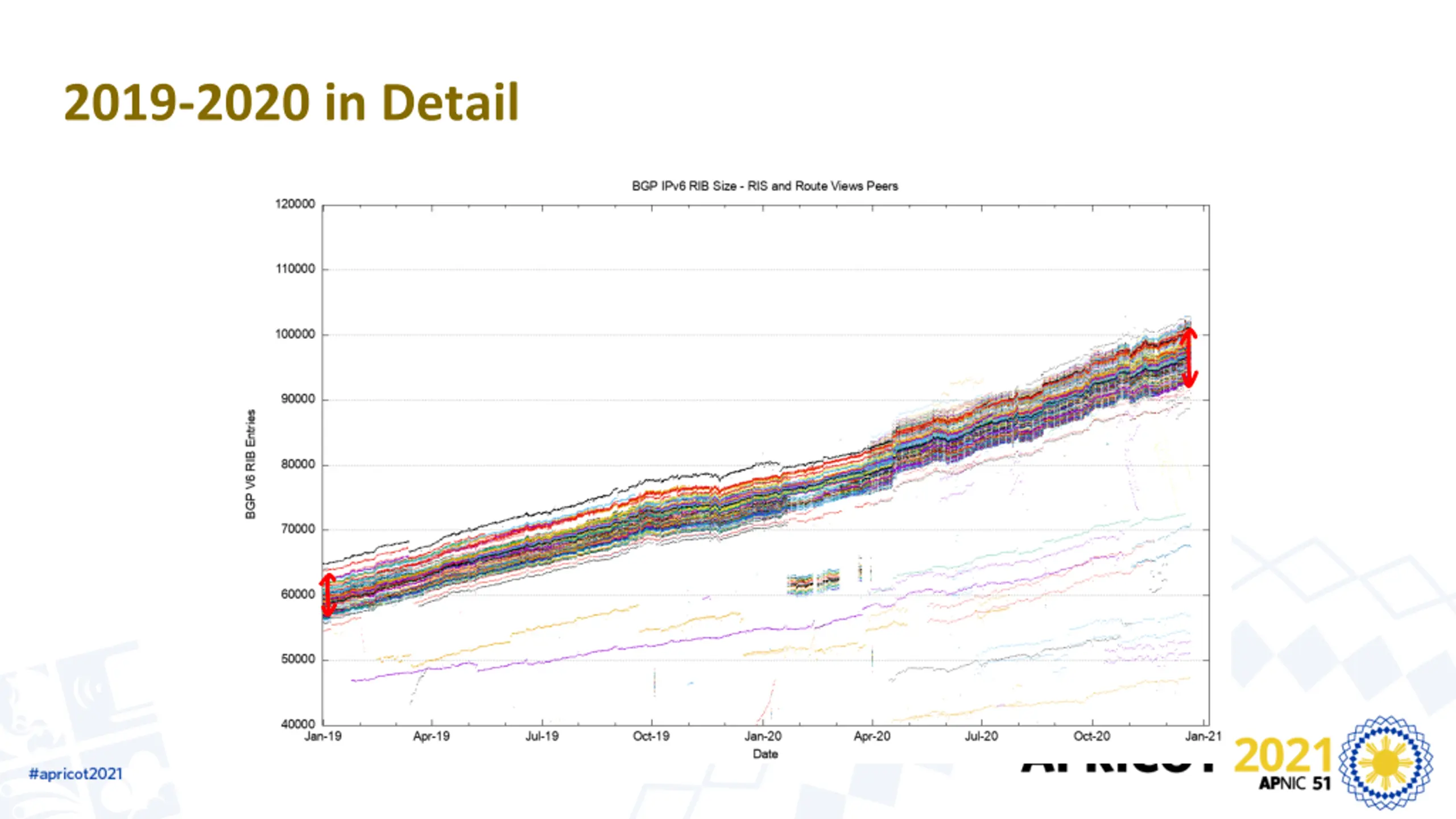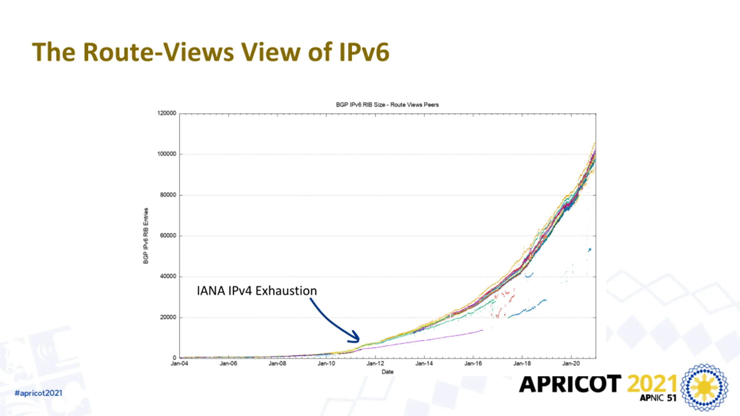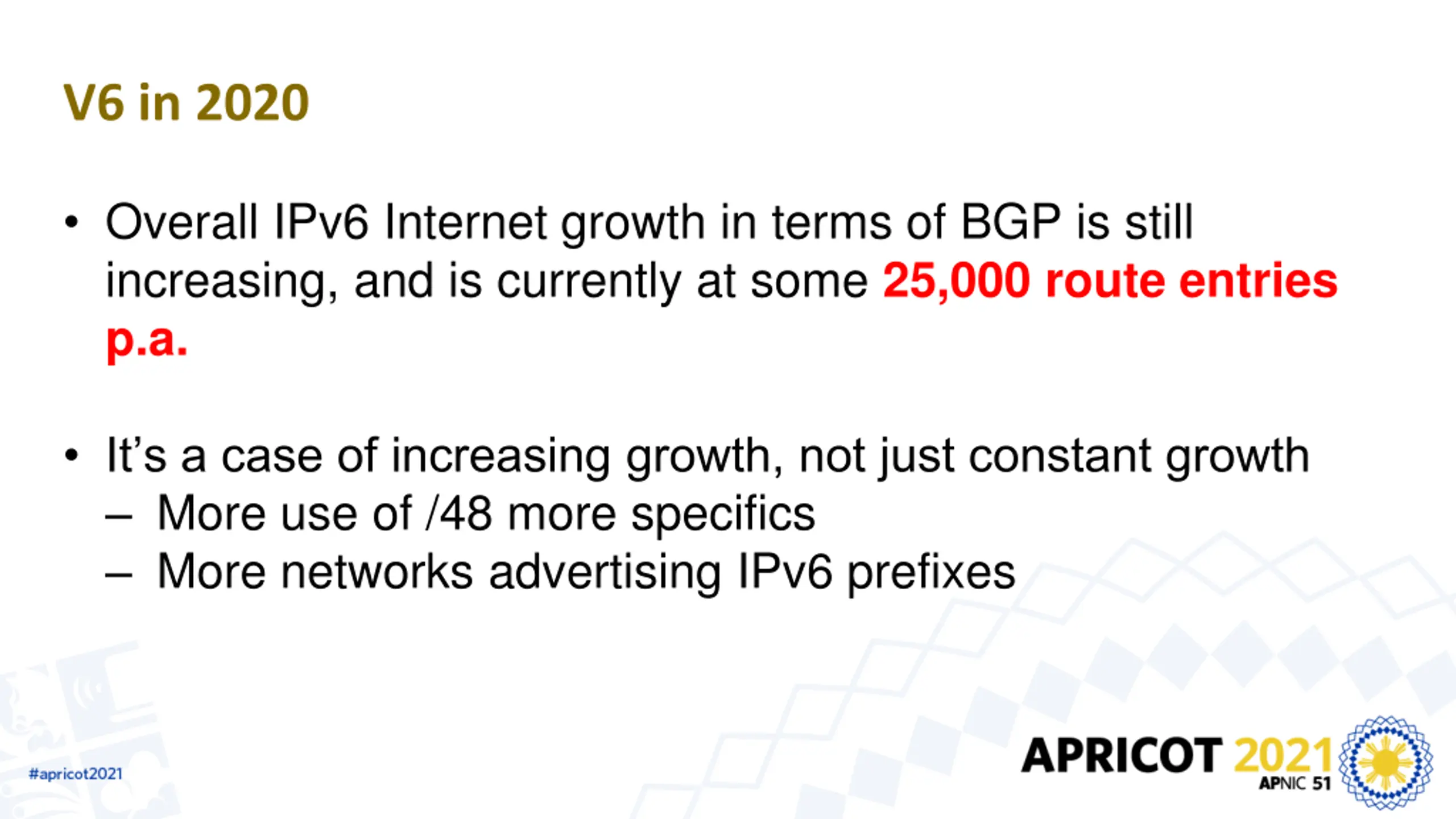 V6 in 2020 Overall IPv6 Internet growth in terms of BGP is still increasing, and is currently at some 25,000 route entries p.a. It s a case of increasing growth, not just constant growth More use of /48 more specifics More networks advertising IPv6 prefixes