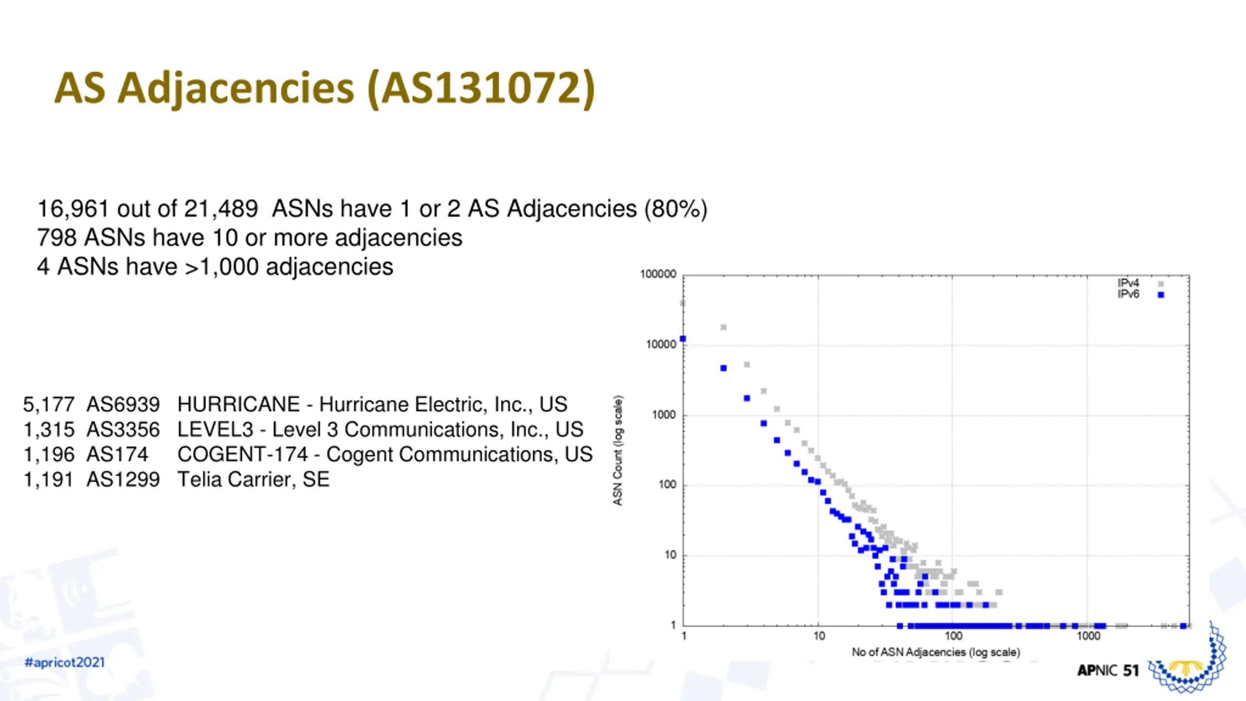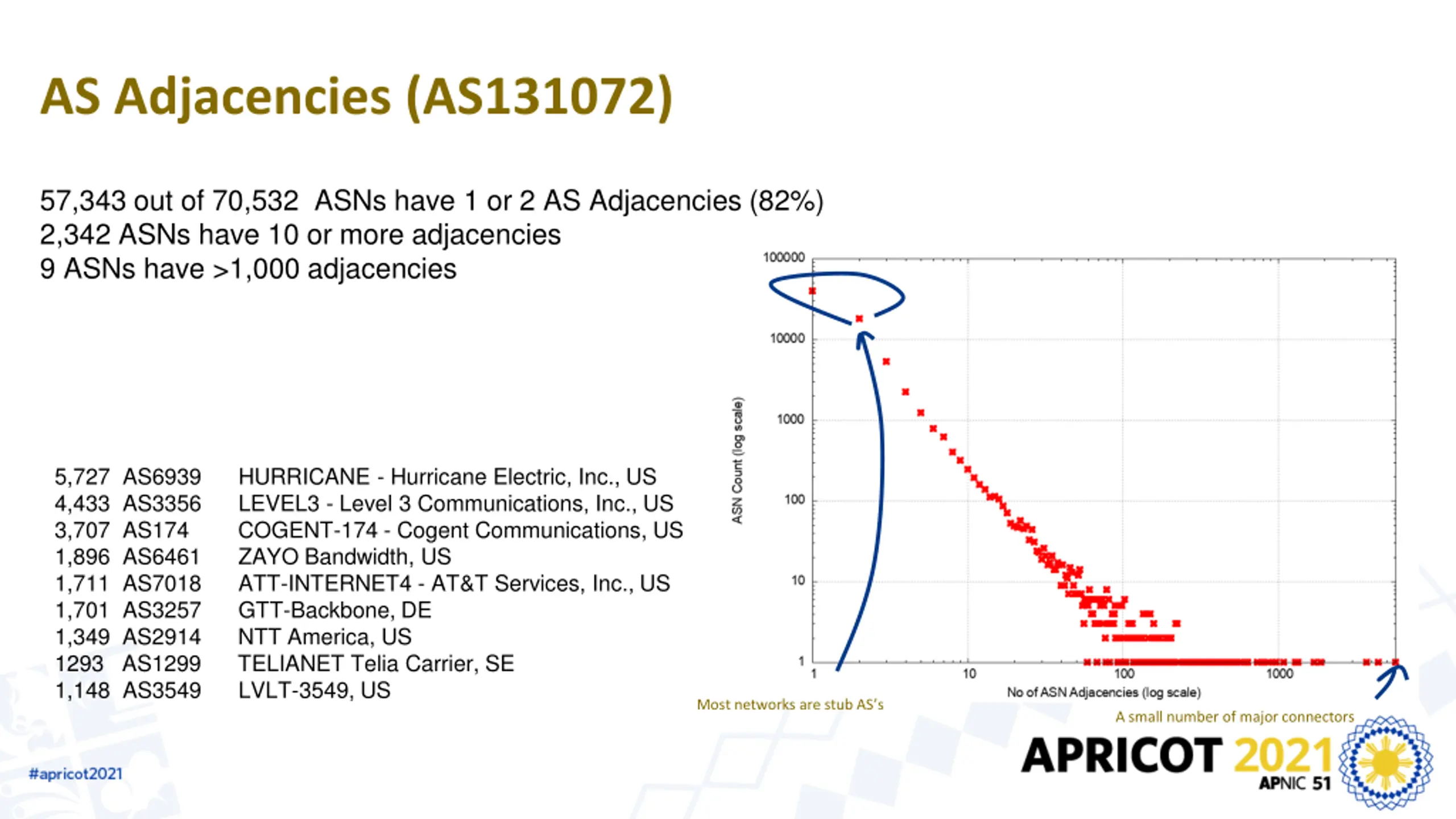 AS Adjacencies (AS131072) 16,961 out of 21,489 ASNs have 1 or 2 AS Adjacencies (80%) 798 ASNs have 10 or more adjacencies 4 ASNs have >1,000 adjacencies 5,177 AS6939 HURRICANE - Hurricane Electric, Inc., US 1,315 AS3356 LEVEL3 - Level 3 Communications, Inc., US 1,196 AS174 COGENT-174 - Cogent Communications, US 1,191 AS1299 Telia Carrier, SE