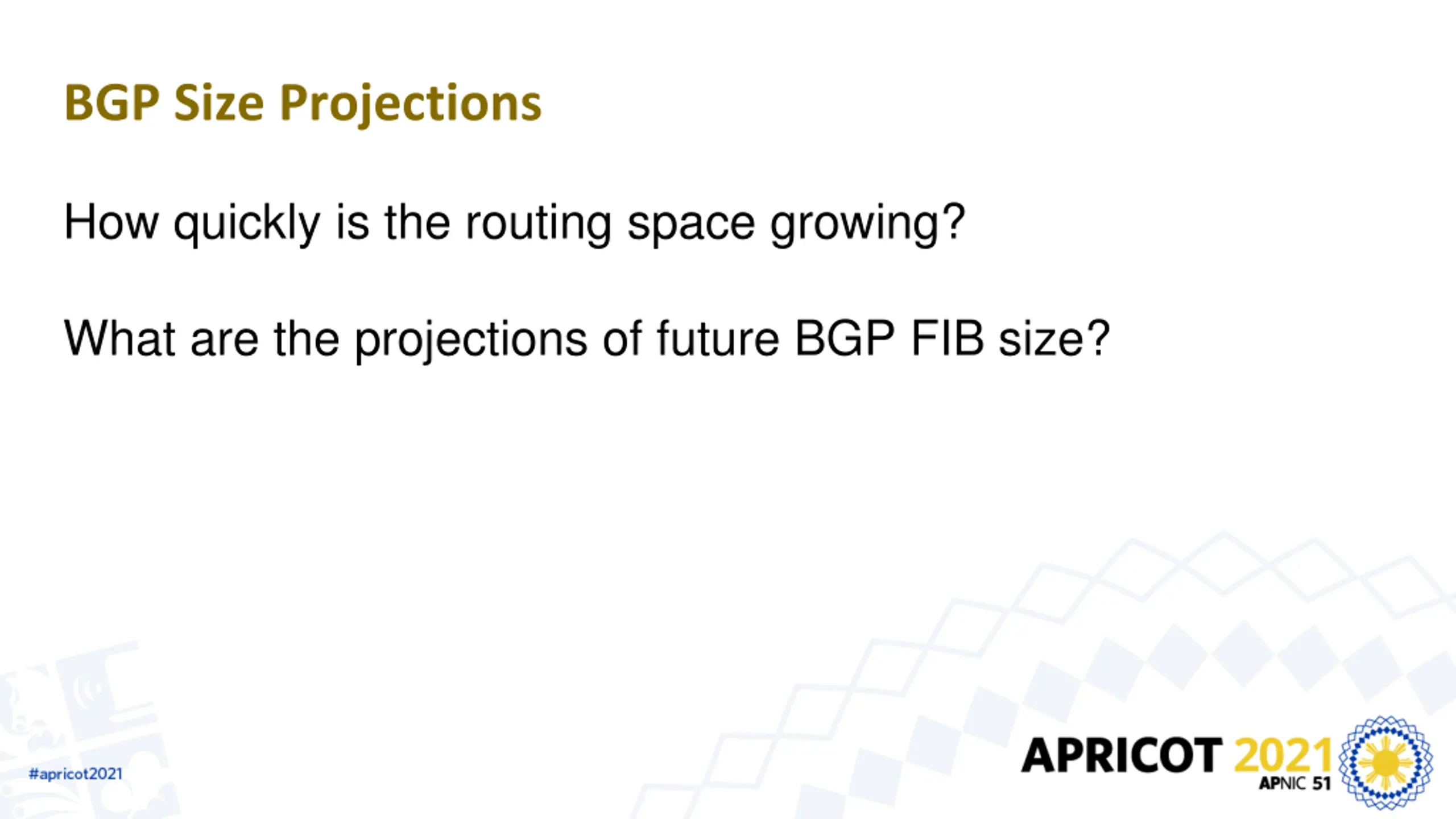 BGP Size Projections How quickly is the routing space growing? What are the projections of future BGP FIB size?
