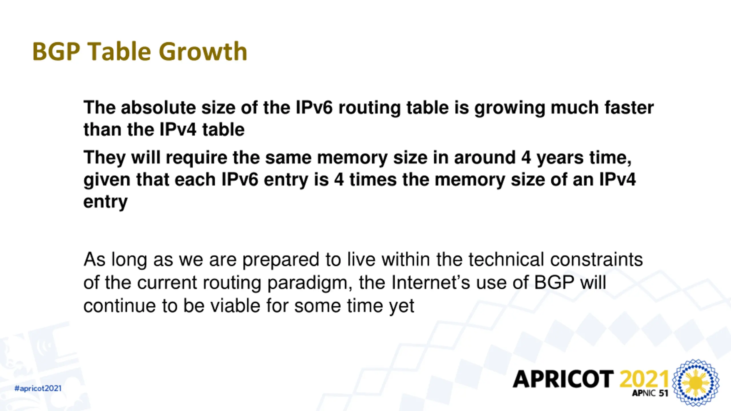 BGP Table Growth The absolute size of the IPv6 routing table is growing much faster than the IPv4 table They will require the same memory size in around 4 years time, given that each IPv6 entry is 4 times the memory size of an IPv4 entry As long as we are prepared to live within the technical constraints of the current routing paradigm, the Internet s use of BGP will continue to be viable for some time yet