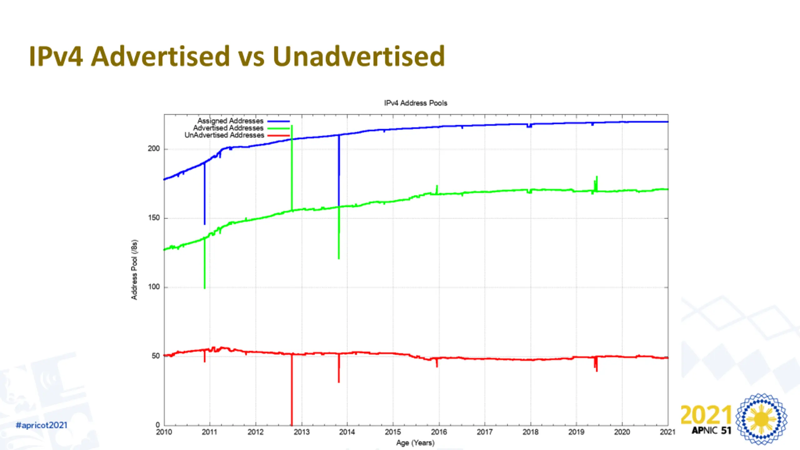 Advertised Address Age 2010 2% of all new addresses announced in 2010 were >= 20 years old (legacy) 80% of all new addresses announced in 2010 were allocated or assigned within the past 12 months