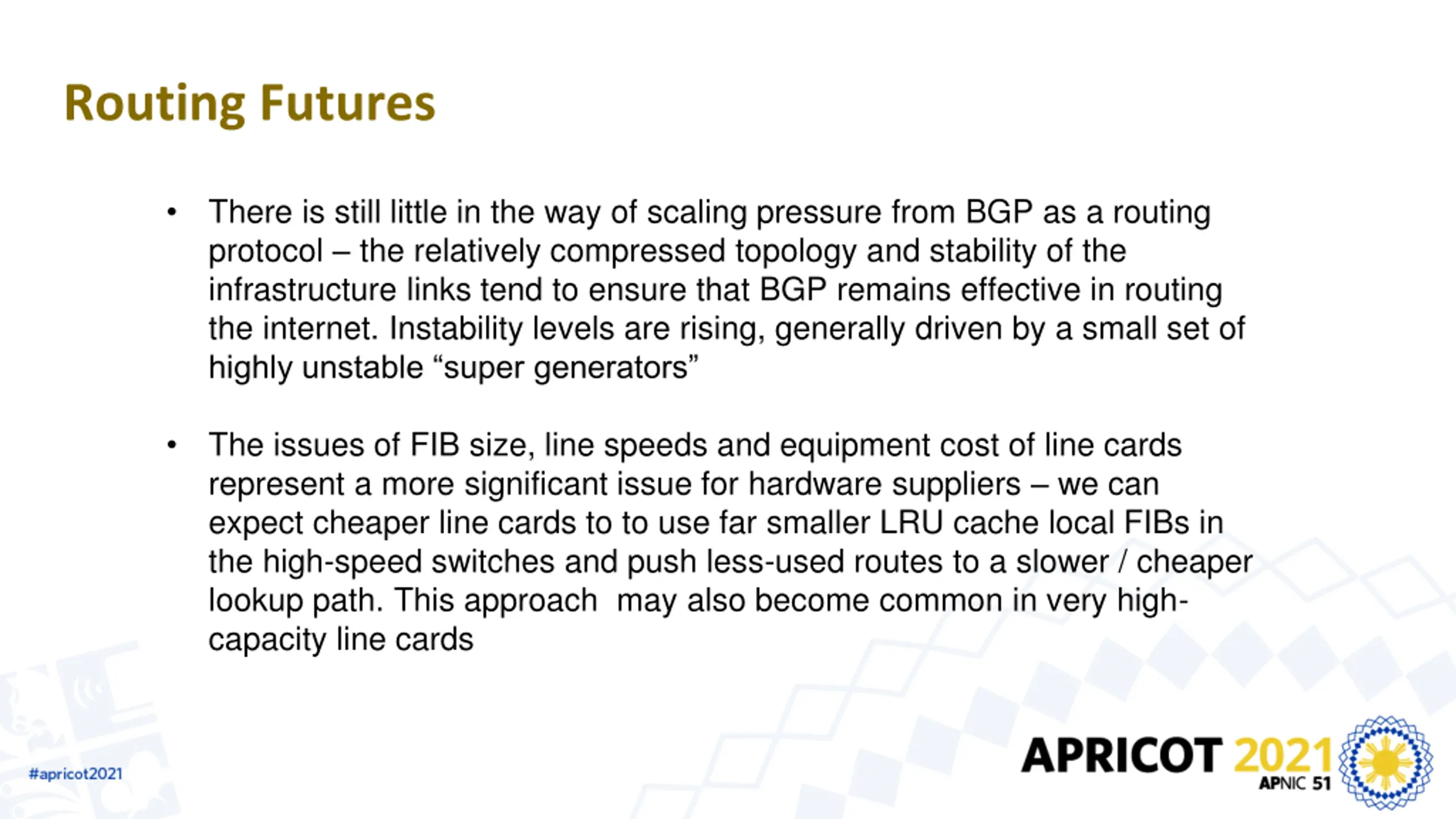 Routing Futures There is still little in the way of scaling pressure from BGP as a routing protocol the relatively compressed topology and stability of the infrastructure links tend to ensure that BGP remains effective in routing the internet. Instability levels are rising, generally driven by a small set of highly unstable super generators The issues of FIB size, line speeds and equipment cost of line cards represent a more significant issue for hardware suppliers we can expect cheaper line cards to to use far smaller LRU cache local FIBs in the high-speed switches and push less-used routes to a slower / cheaper lookup path. This approach may also become common in very high- capacity line cards