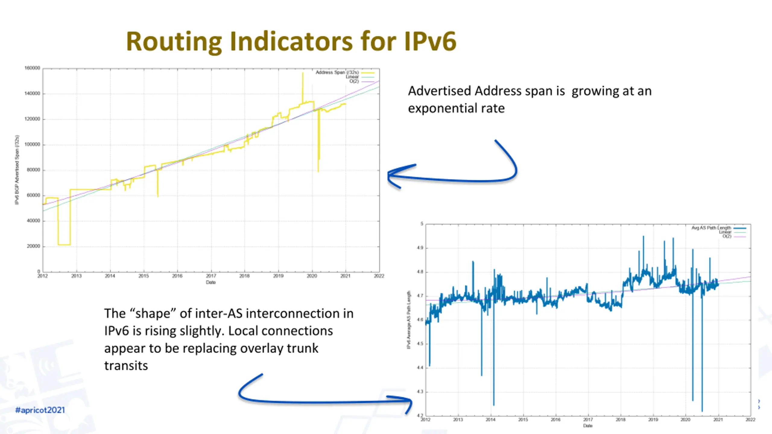 Routing Indicators for IPv6 Advertised Address span is growing at an exponential rate The shape of inter-AS interconnection in IPv6 is rising slightly. Local connections appear to be replacing overlay trunk transits