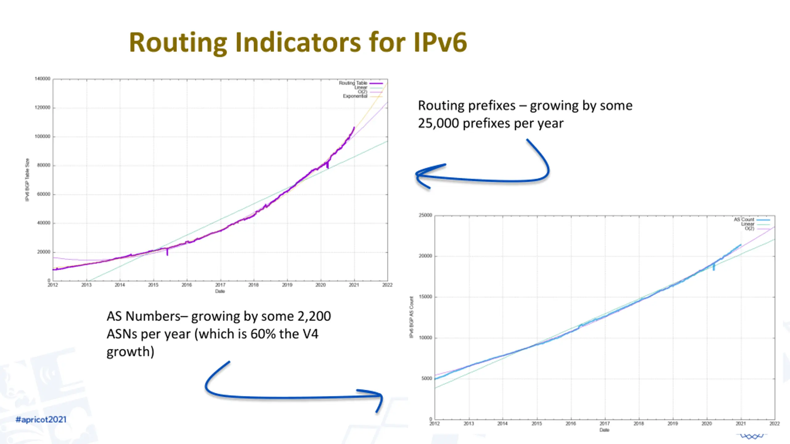 Routing Indicators for IPv6 Routing prefixes growing by some 25,000 prefixes per year AS Numbers growing by some 2,200 ASNs per year (which is 60% the V4 growth)