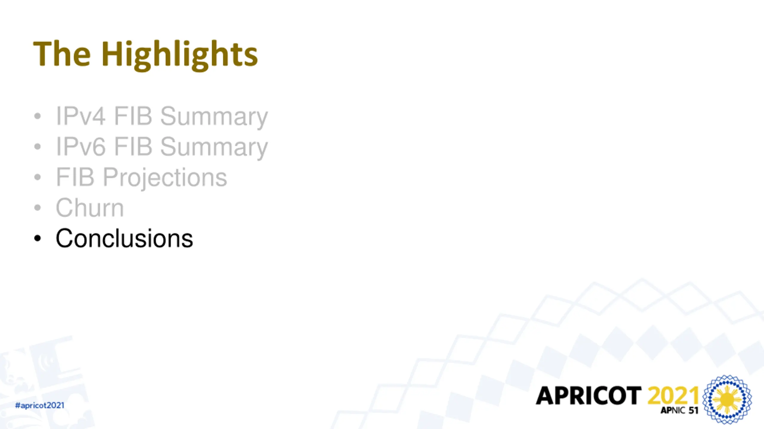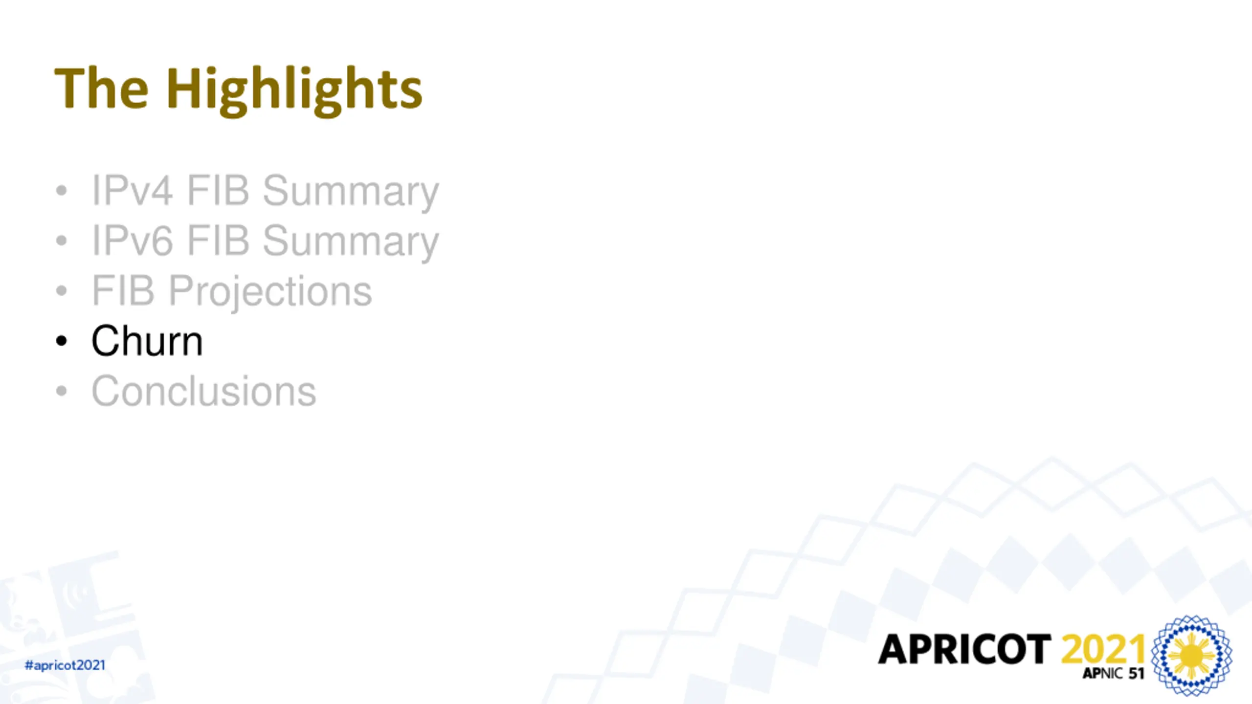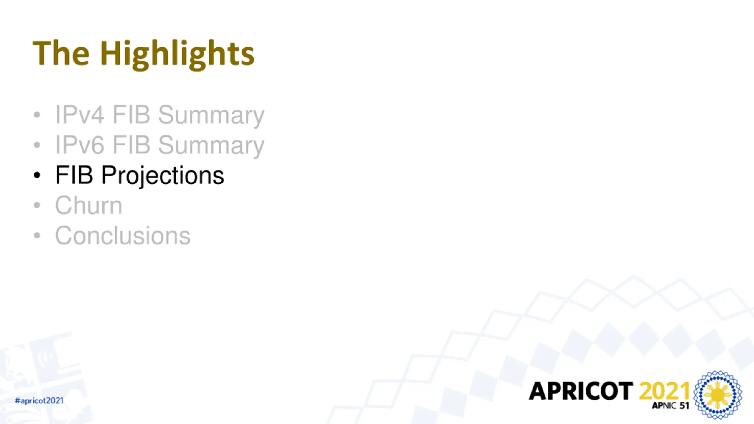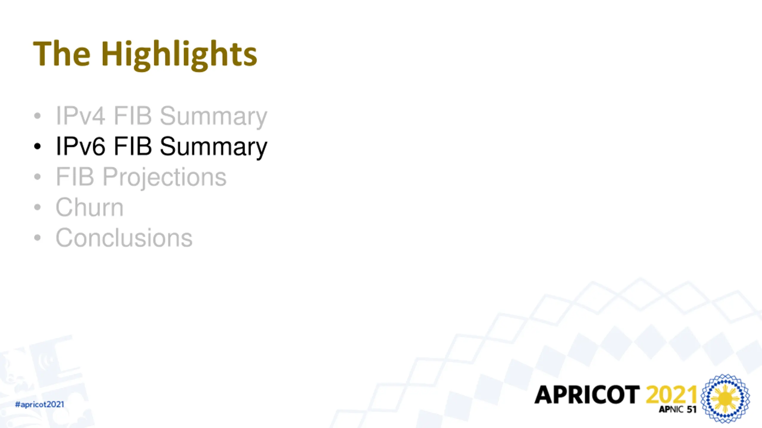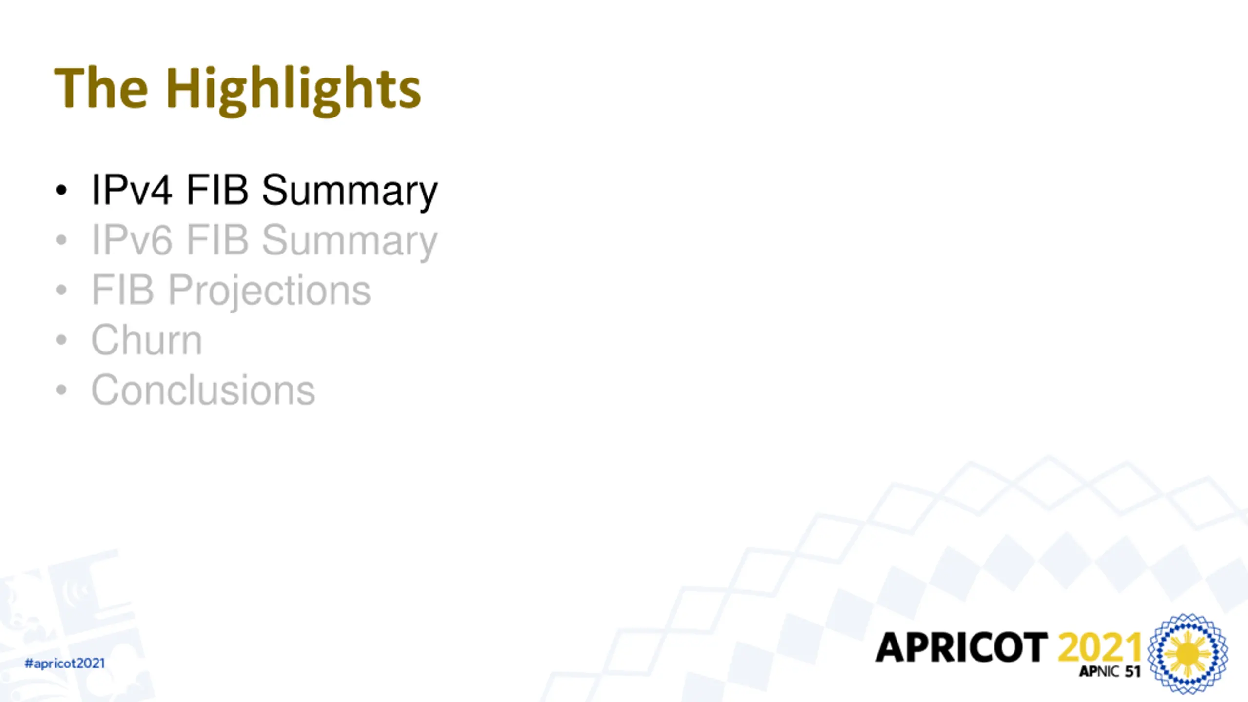 The Highlights IPv4 FIB Summary IPv6 FIB Summary FIB Projections Churn Conclusions
