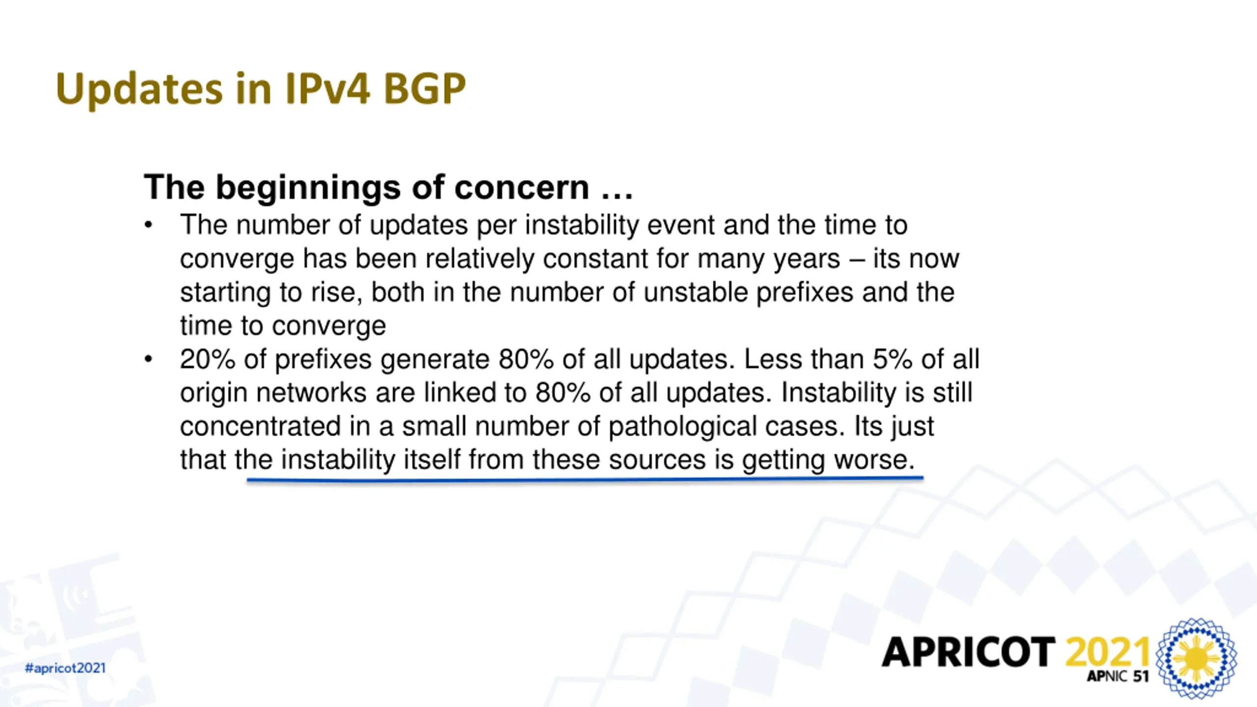 Updates in IPv4 BGP The beginnings of concern The number of updates per instability event and the time to converge has been relatively constant for many years its now starting to rise, both in the number of unstable prefixes and the time to converge 20% of prefixes generate 80% of all updates. Less than 5% of all origin networks are linked to 80% of all updates. Instability is still concentrated in a small number of pathological cases. Its just that the instability itself from these sources is getting worse.