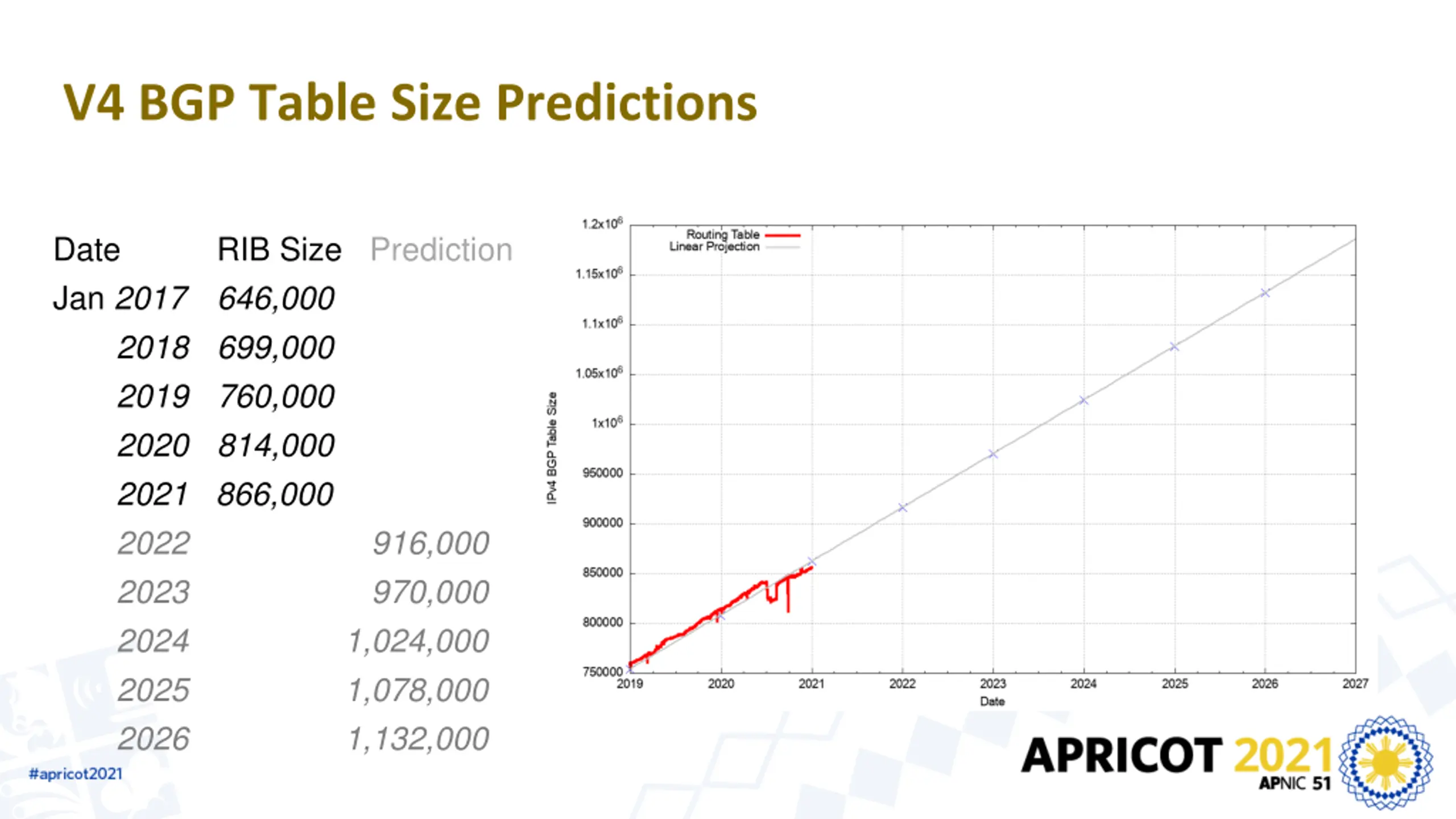 V4 BGP Table Size Predictions Date Jan 2017 2018 699,000 2019 760,000 2020 814,000 2021 866,000 2022 2023 2024 2025 2026 RIB Size Prediction 646,000 916,000 970,000 1,024,000 1,078,000 1,132,000