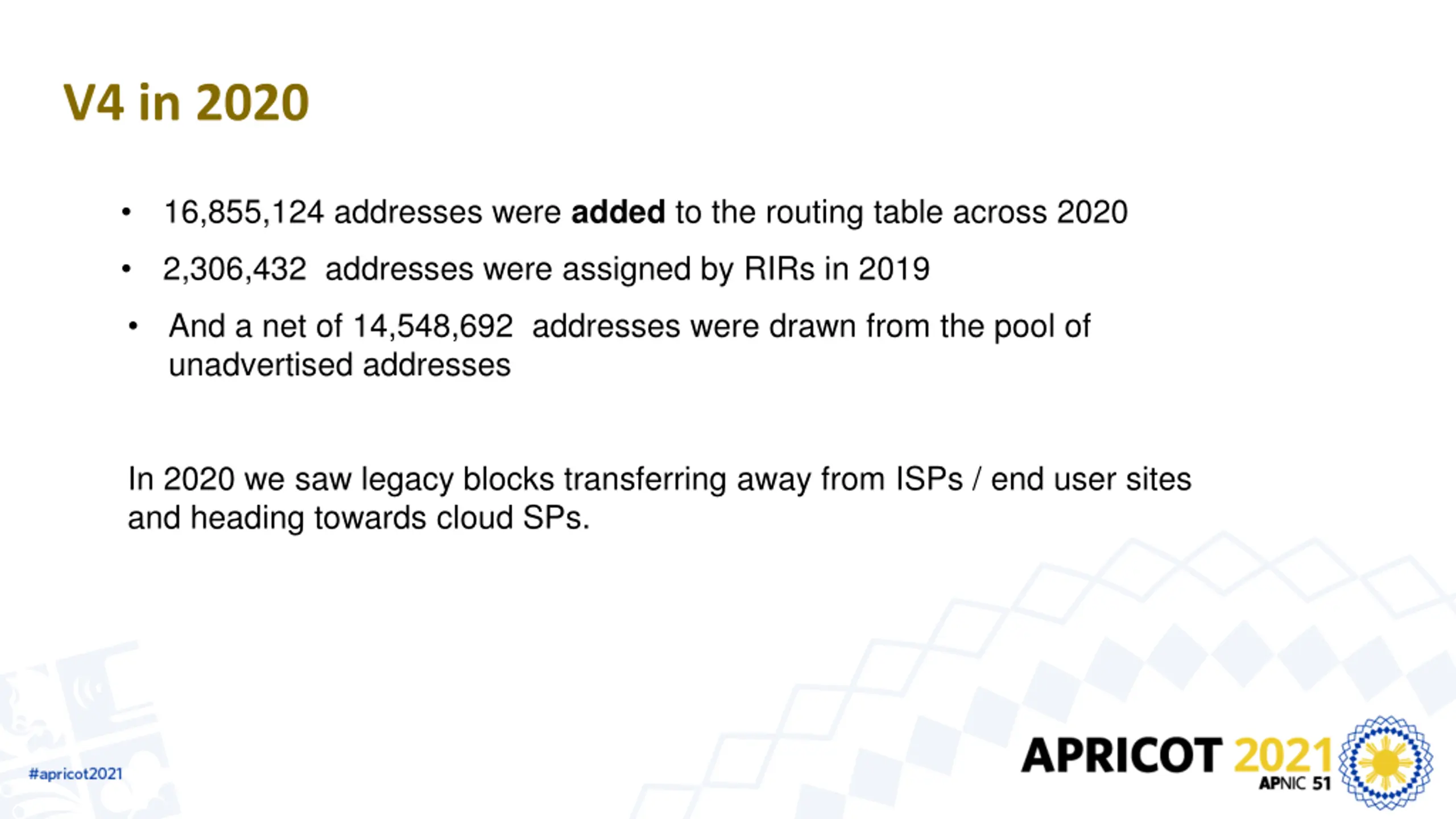 V4 in 2020 16,855,124 addresses were added to the routing table across 2020 2,306,432 addresses were assigned by RIRs in 2019 And a net of 14,548,692 addresses were drawn from the pool of unadvertised addresses In 2020 we saw legacy blocks transferring away from ISPs / end user sites and heading towards cloud SPs.