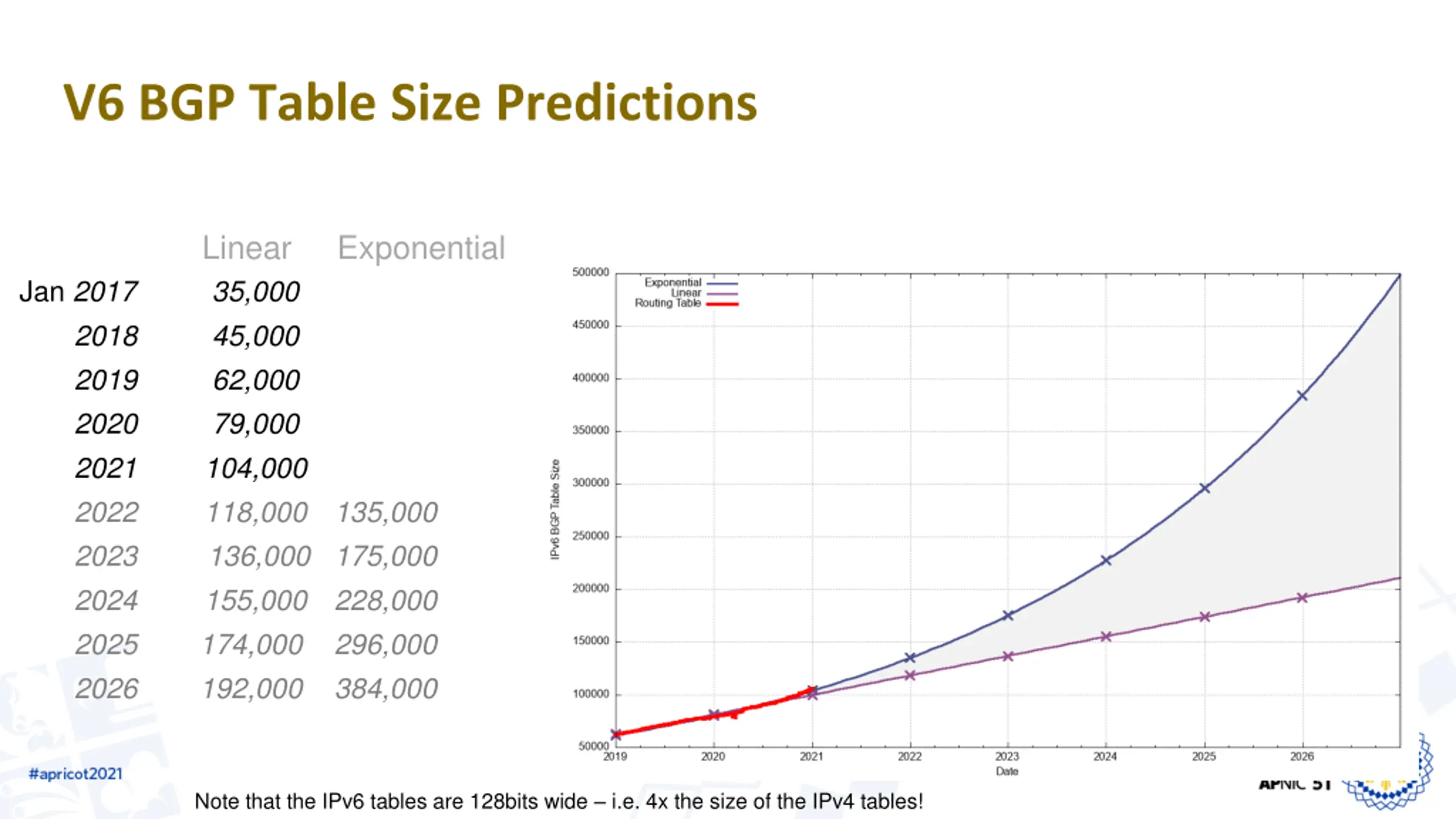 V6 BGP Table Size Predictions Linear Exponential Jan 2017 2018 2019 2020 2021 2022 2023 136,000 175,000 2024 155,000 2025 174,000 2026 192,000 35,000 45,000 62,000 79,000 104,000 118,000 135,000 228,000 296,000 384,000 Note that the IPv6 tables are 128bits wide i.e. 4x the size of the IPv4 tables!
