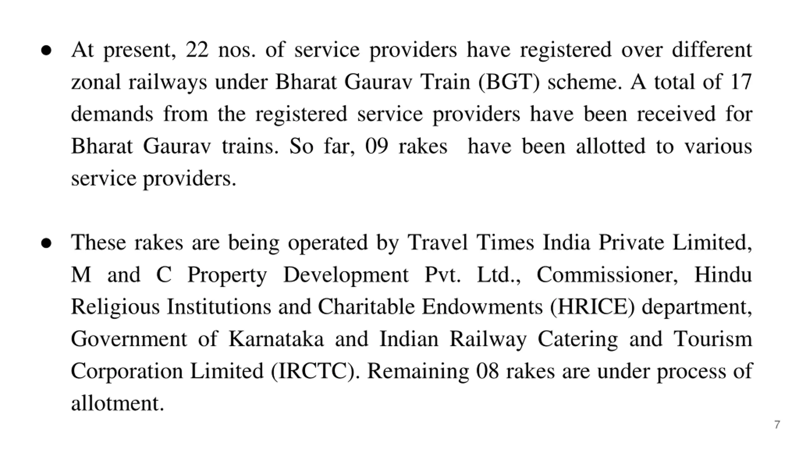 At present, 22 nos. of service providers have registered over different zonal railways under Bharat Gaurav Train (BGT) scheme. A total of 17 demands from the registered service providers have been received for Bharat Gaurav trains. So far, 09 rakes have been allotted to various service providers. These rakes are being operated by Travel Times India Private Limited, M and C Property Development Pvt. Ltd., Commissioner, Hindu Religious Institutions and Charitable Endowments (HRICE) department, Government of Karnataka and Indian Railway Catering and Tourism Corporation Limited (IRCTC). Remaining 08 rakes are under process of allotment. 7