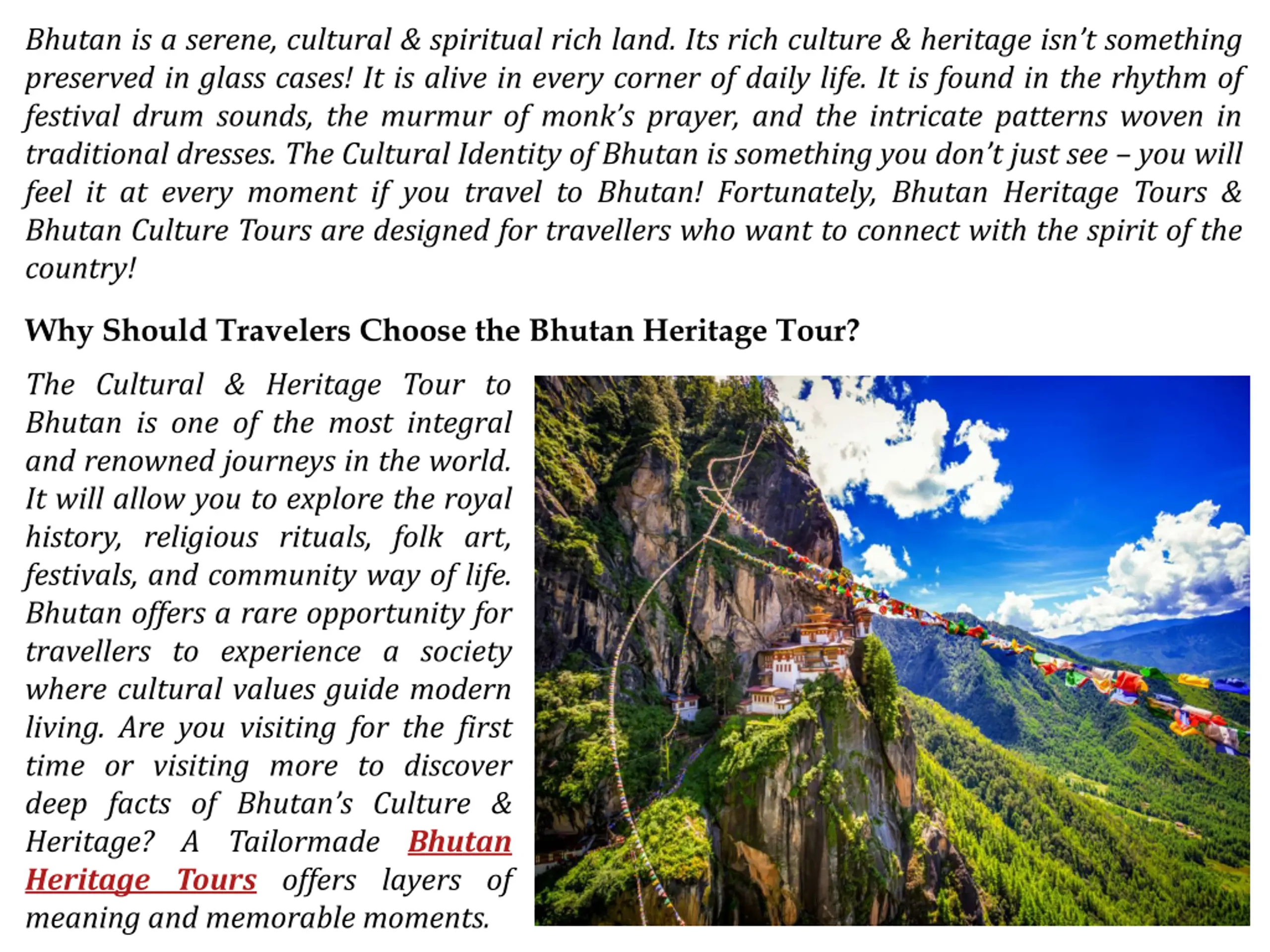 Bhutan is a serene, cultural & spiritual rich land. Its rich culture & heritage isnt something preserved in glass cases! It is alive in every corner of daily life. It is found in the rhythm of festival drum sounds, the murmur of monk s prayer, and the intricate patterns woven in traditional dresses. The Cultural Identity of Bhutan is something you don t just see you will feel it at every moment if you travel to Bhutan! Fortunately, Bhutan Heritage Tours & Bhutan Culture Tours are designed for travellers who want to connect with the spirit of the country! Why Should Travelers Choose the Bhutan Heritage Tour? The Cultural & Heritage Tour to Bhutan is one of the most integral and renowned journeys in the world. It will allow you to explore the royal history, religious rituals, folk art, festivals, and community way of life. Bhutan offers a rare opportunity for travellers to experience a society where cultural values guide modern living. Are you visiting for the first time or visiting more to discover deep facts of Bhutan s Culture & Heritage? A Tailormade Bhutan Heritage Tours offers layers of meaning and memorable moments.
