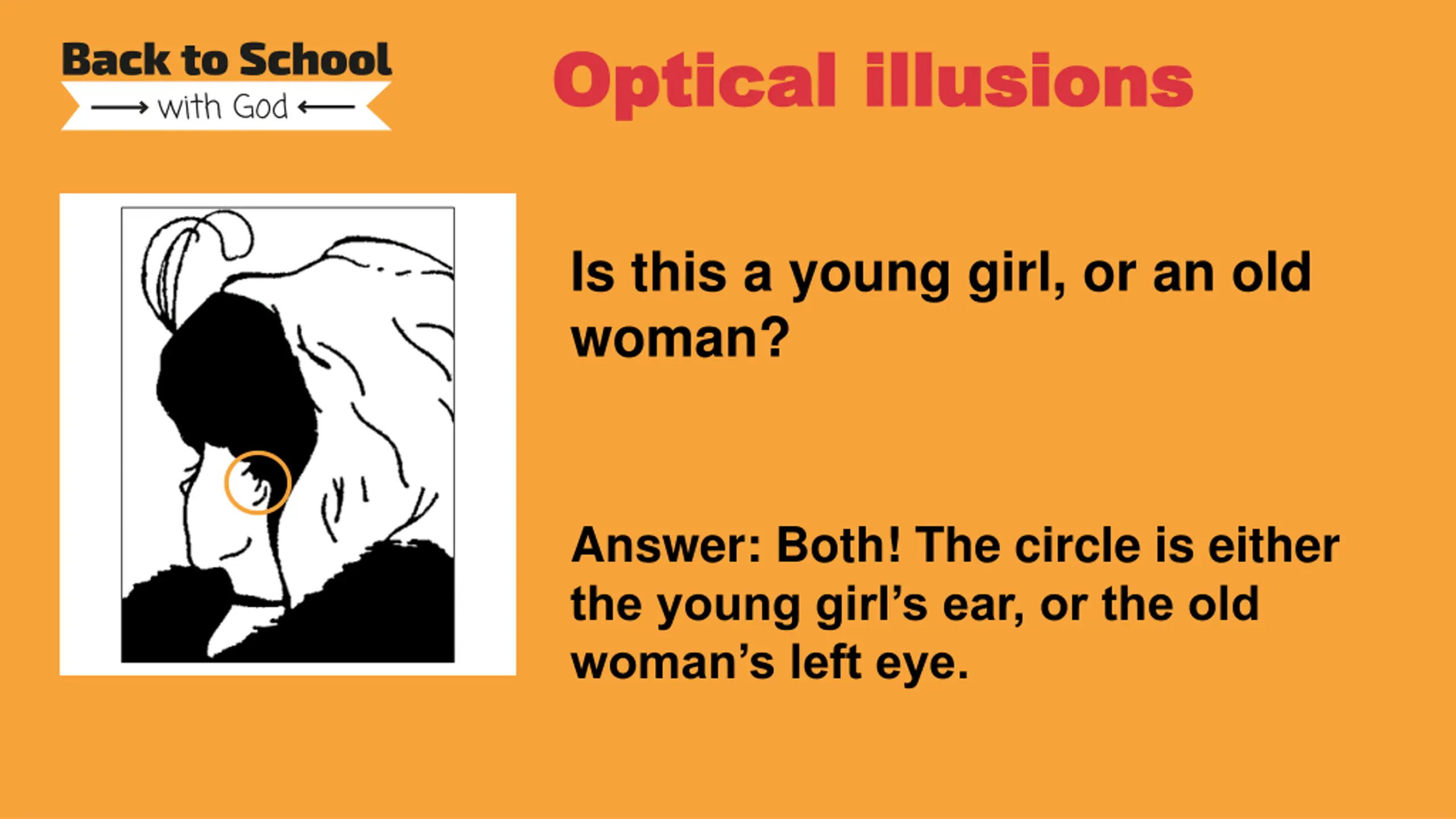 Optical illusions Optical illusions Is this a young girl, or an old woman? Answer: Both! The circle is either the young girl s ear, or the old woman s left eye.