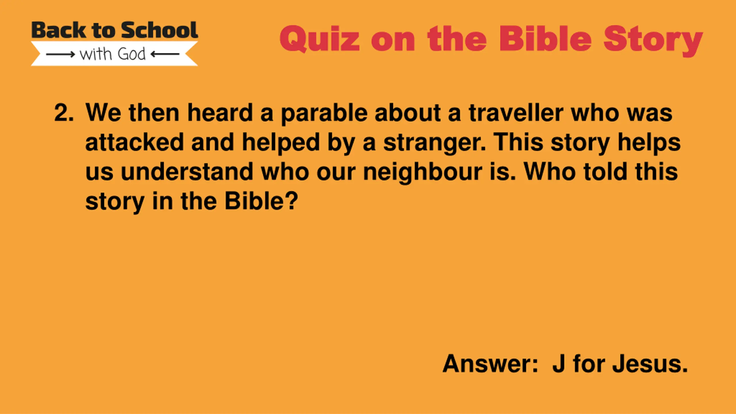 Quiz on the Bible Story Quiz on the Bible Story 2. We then heard a parable about a traveller who was attacked and helped by a stranger. This story helps us understand who our neighbour is. Who told this story in the Bible? Answer: J for Jesus.