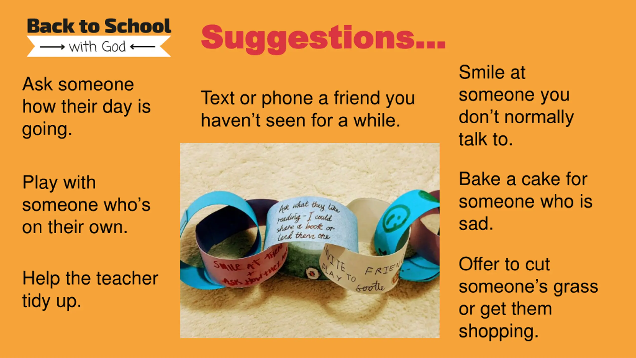 Suggestions Suggestions Smile at someone you don t normally talk to. Ask someone how their day is going. Text or phone a friend you haven t seen for a while. Bake a cake for someone who is sad. Play with someone who s on their own. Offer to cut someone s grass or get them shopping. Help the teacher tidy up.