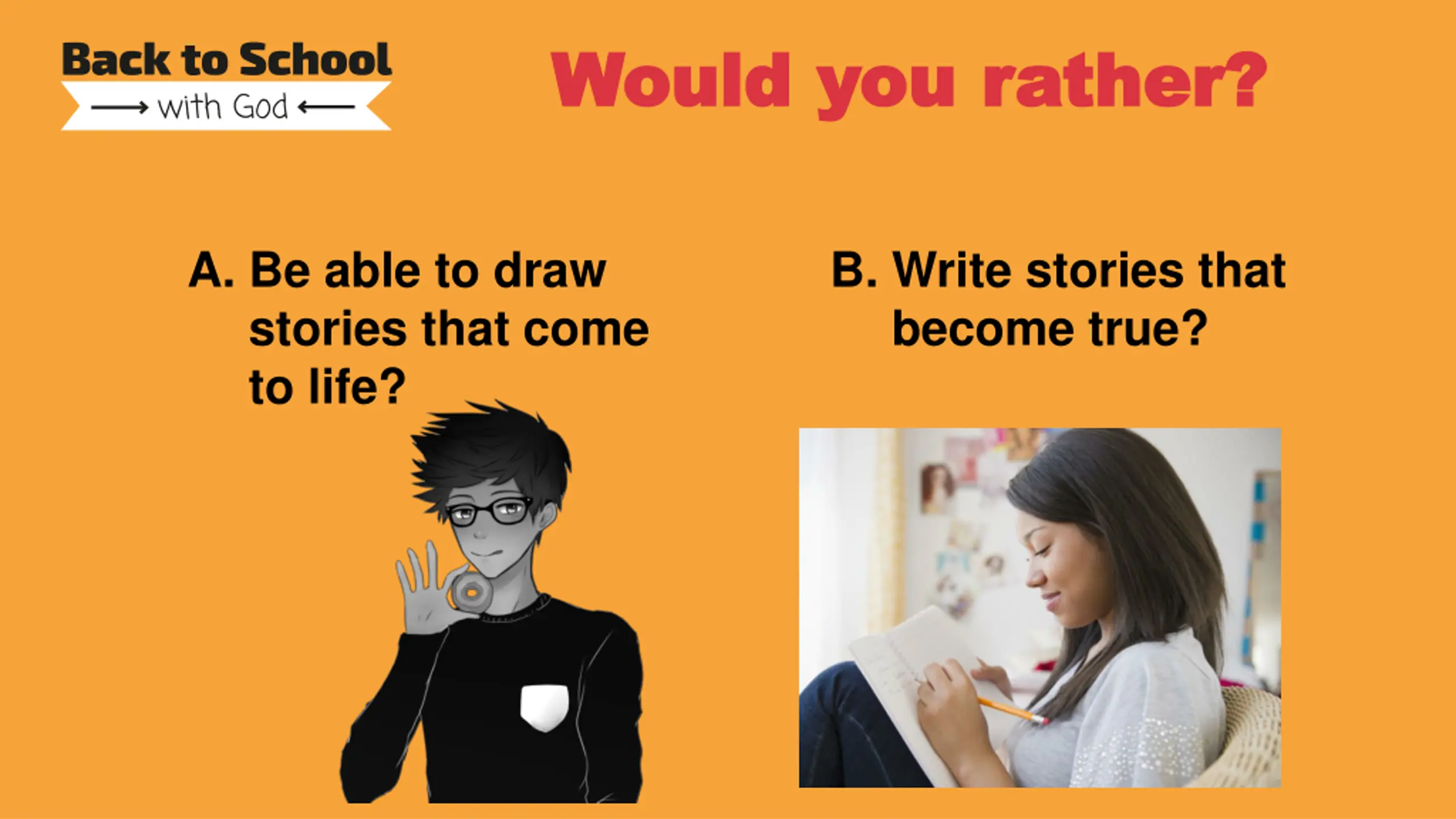 Would you rather? Would you rather? A. Be able to draw stories that come to life? B. Write stories that become true?