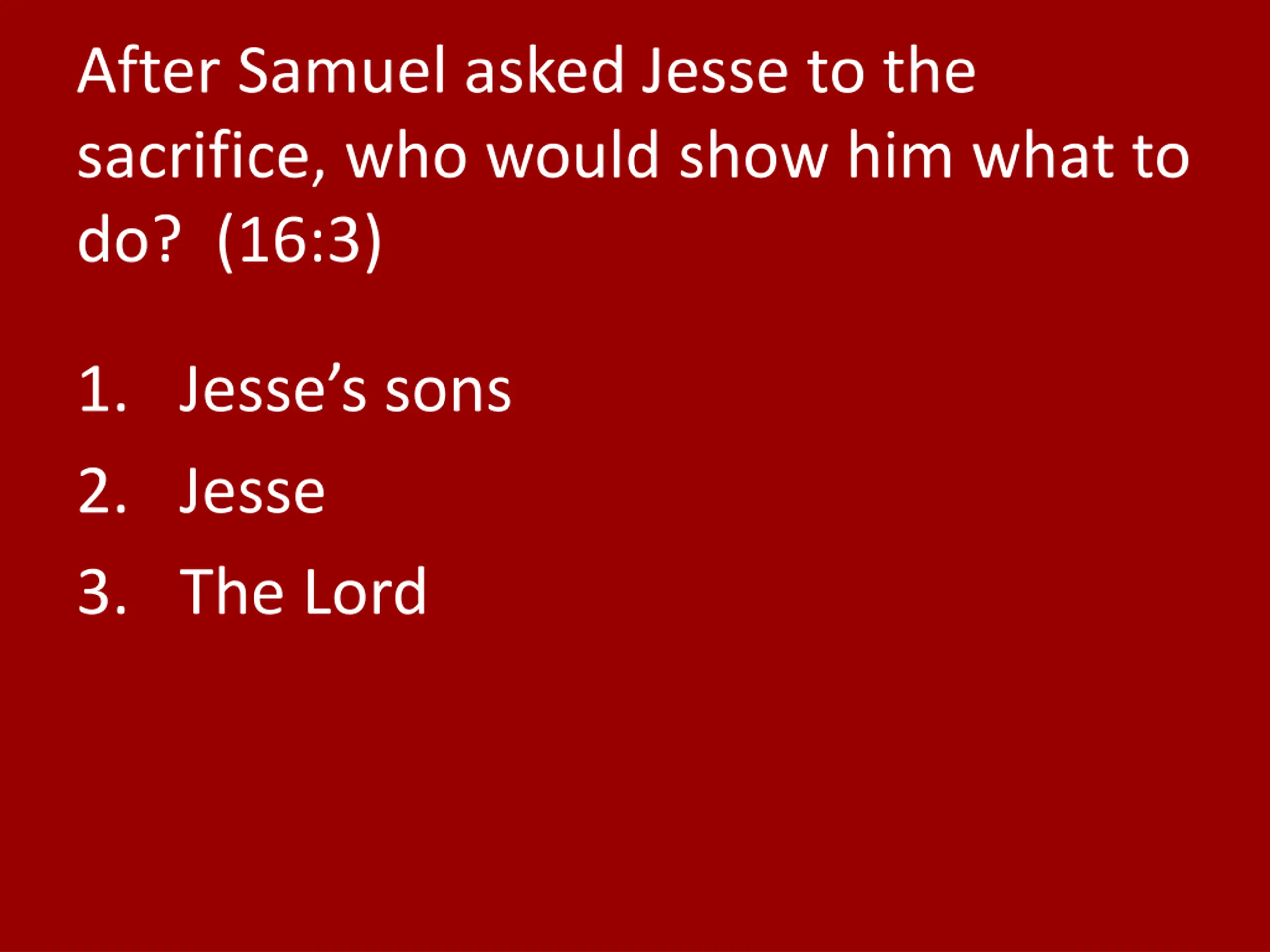 After Samuel asked Jesse to the sacrifice, who would show him what to do? (16:3) 1. Jesse s sons 2. Jesse 3. The Lord