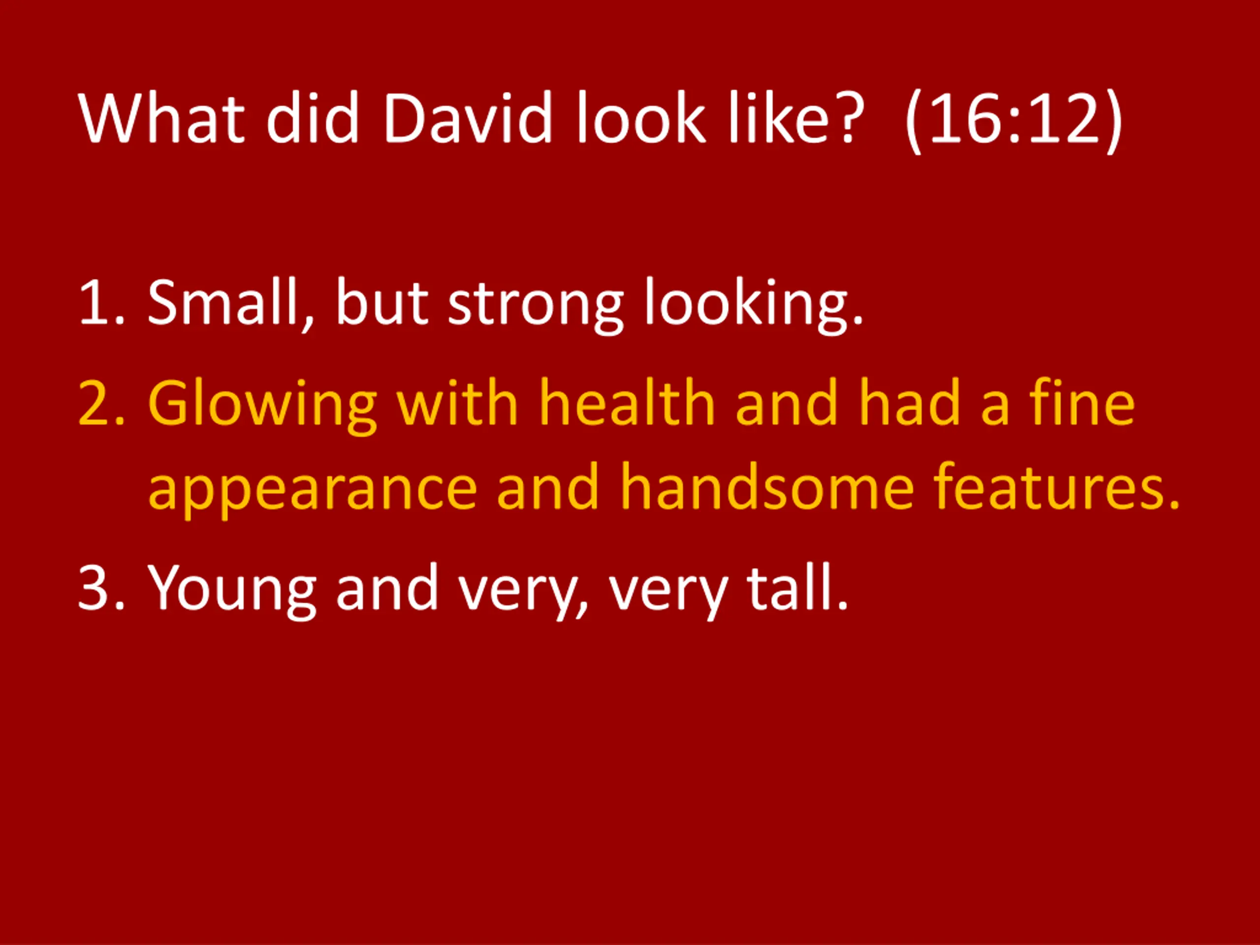 What did David look like? (16:12) 1. Small, but strong looking. 2. Glowing with health and had a fine appearance and handsome features. 3. Young and very, very tall.