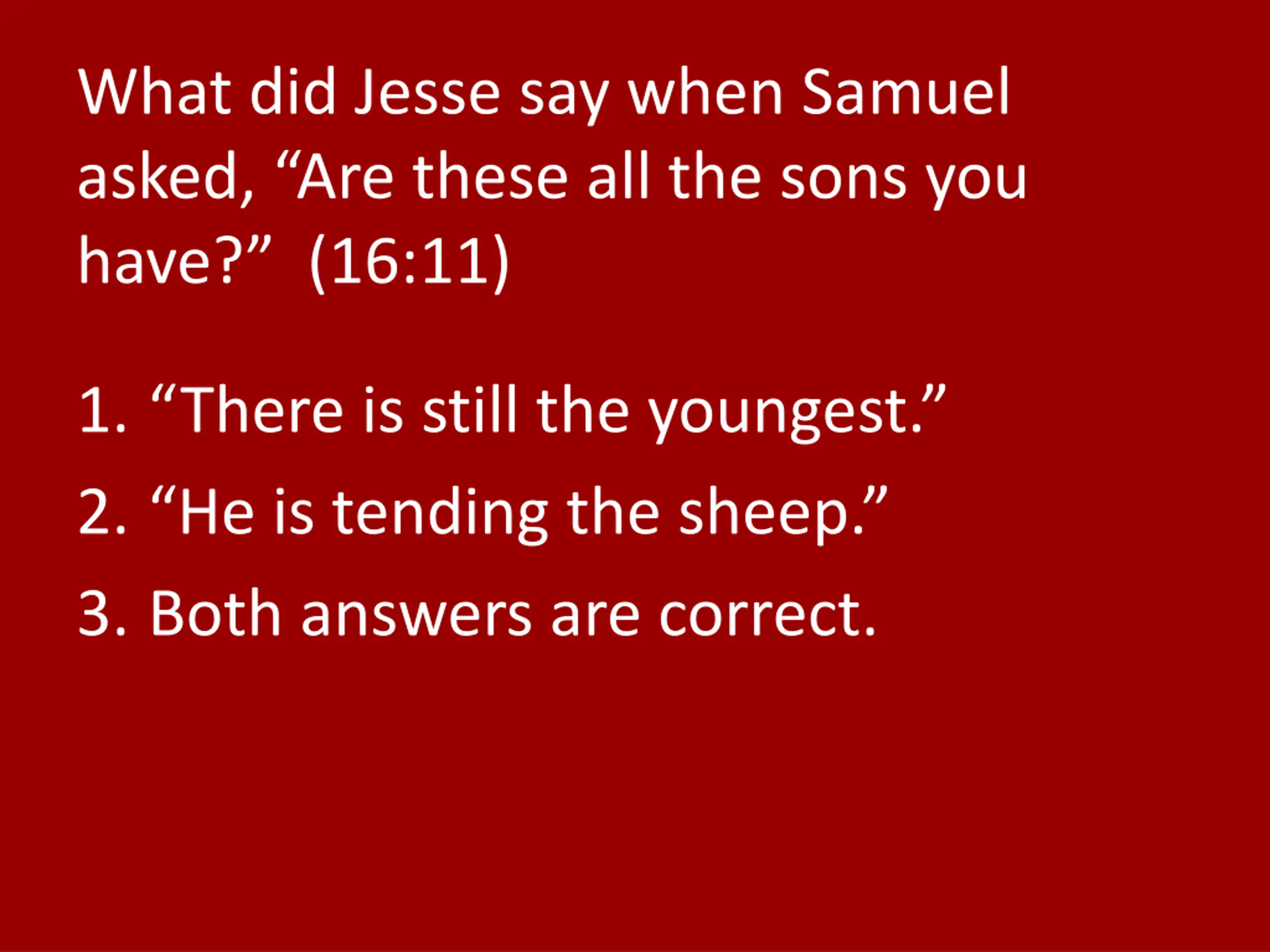 What did Jesse say when Samuel asked, Are these all the sons you have? (16:11) 1. There is still the youngest. 2. He is tending the sheep. 3. Both answers are correct.