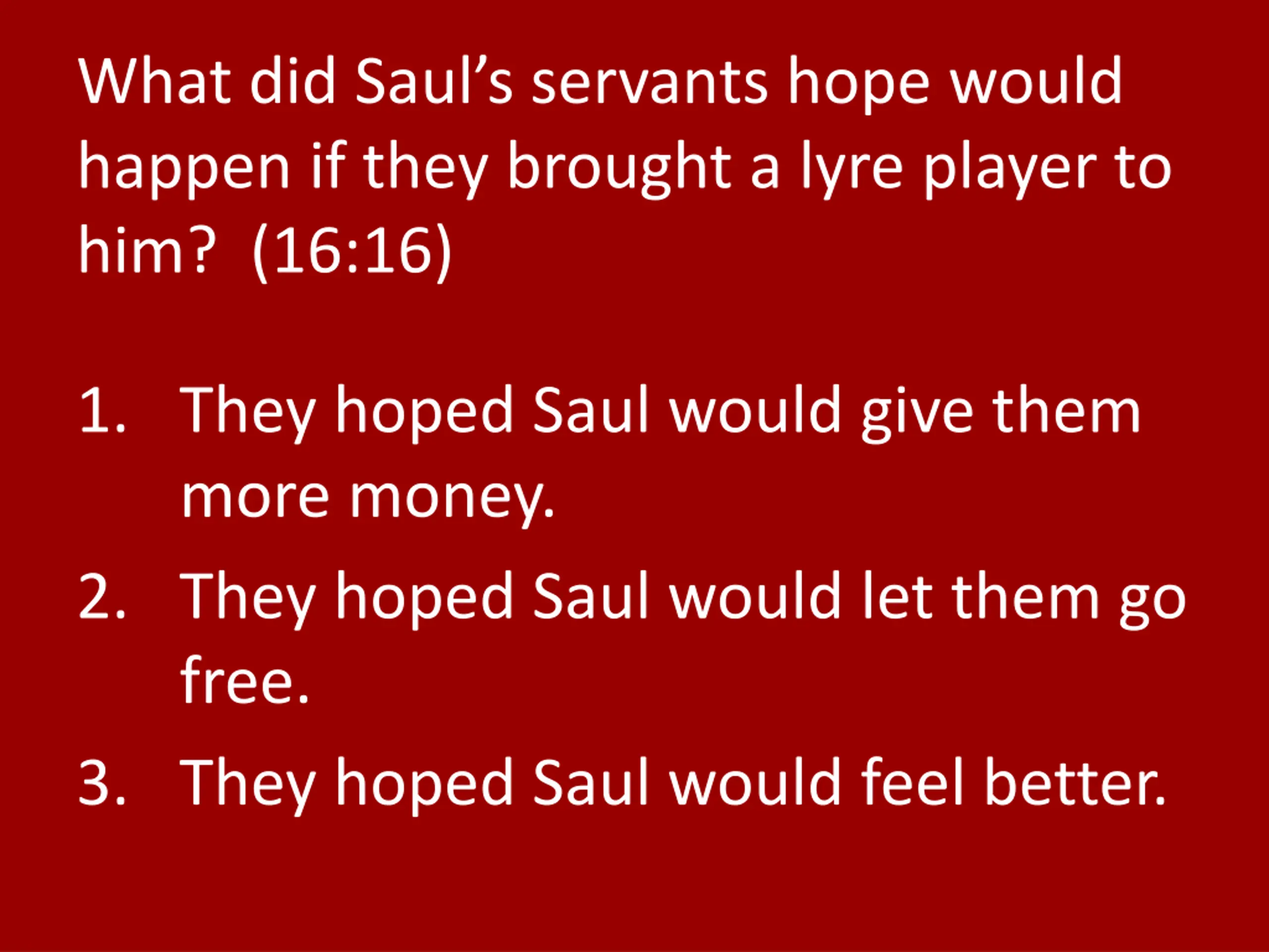 What did Sauls servants hope would happen if they brought a lyre player to him? (16:16) 1. They hoped Saul would give them more money. 2. They hoped Saul would let them go free. 3. They hoped Saul would feel better.