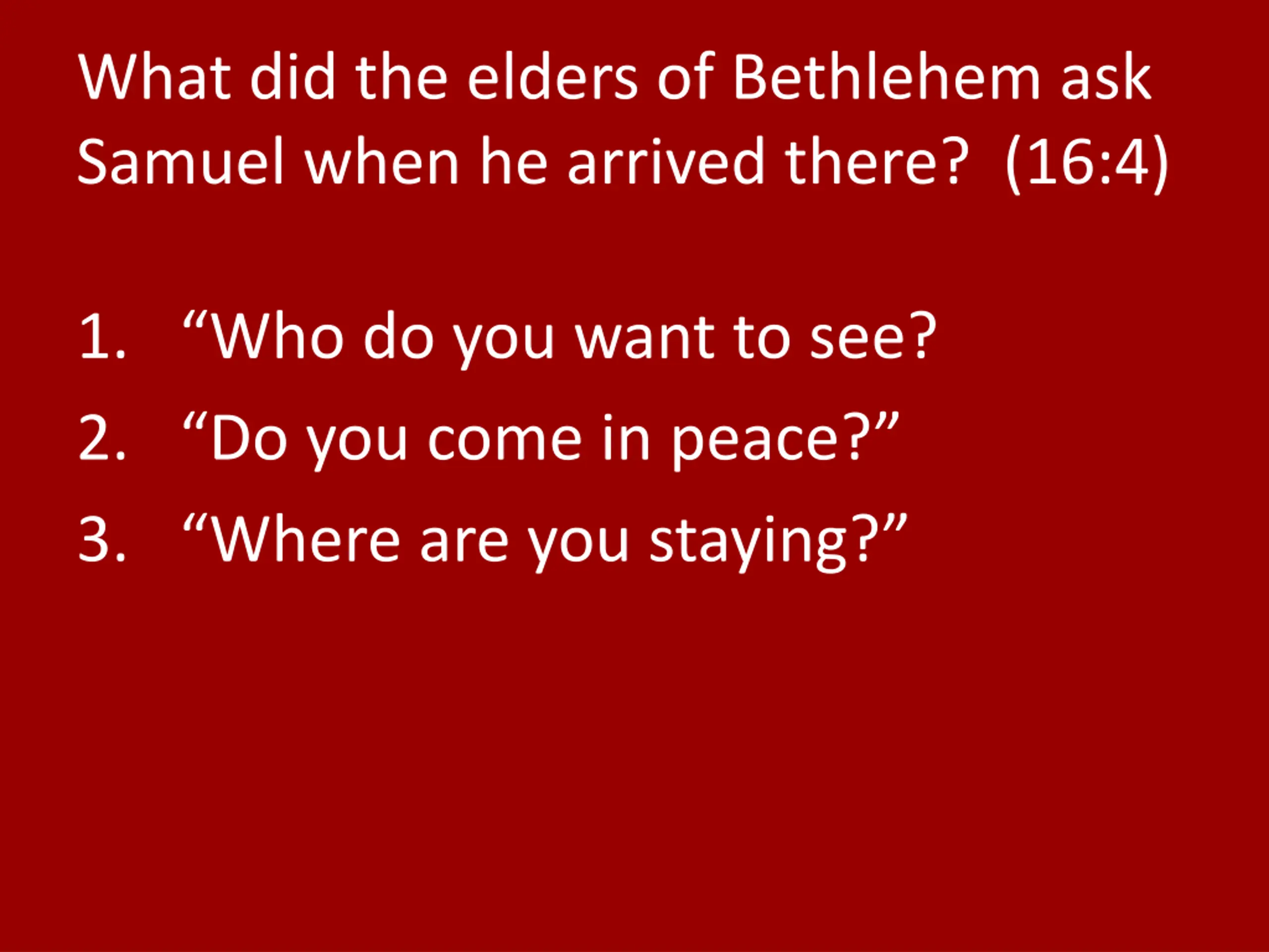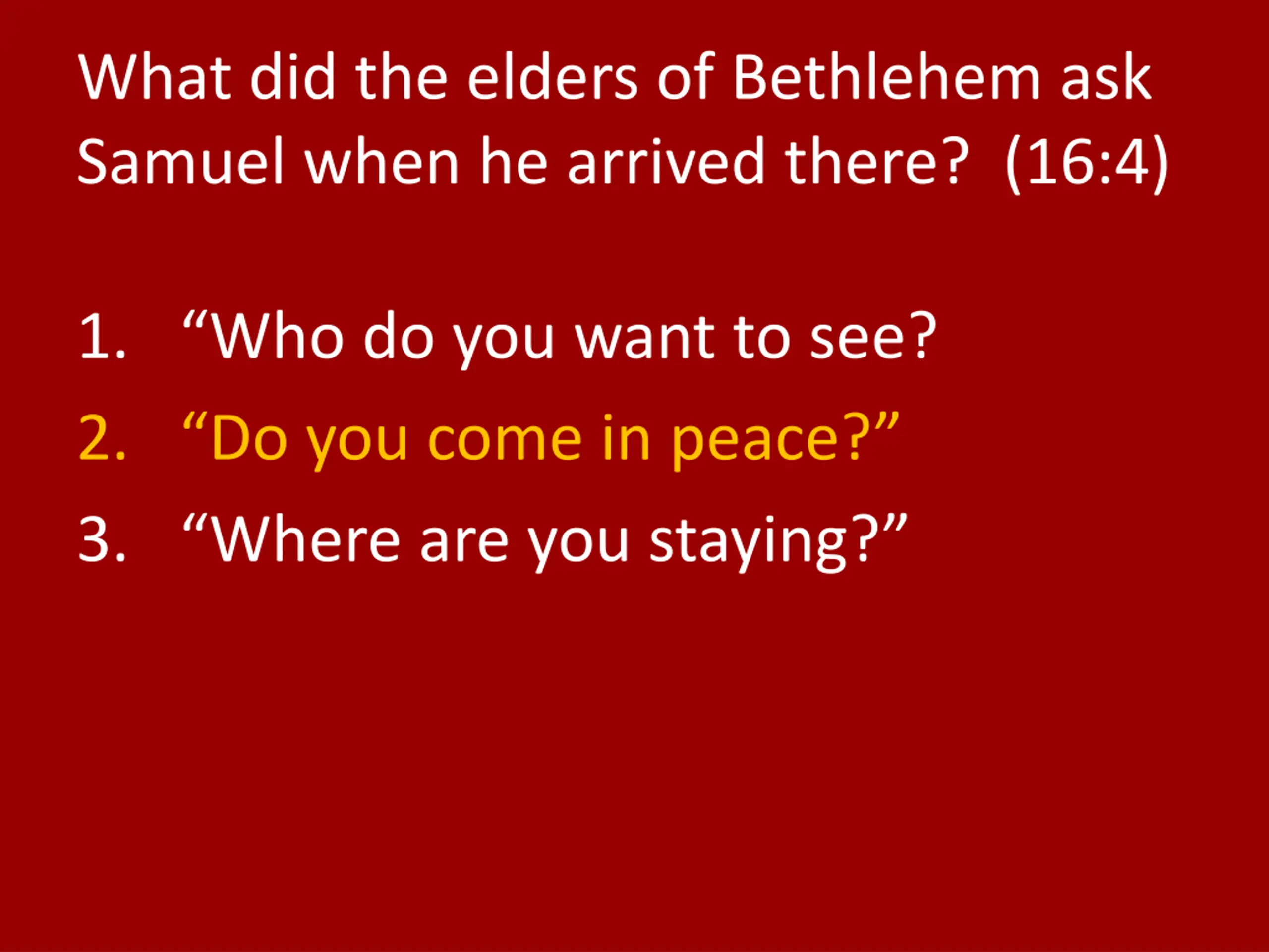 What did the elders of Bethlehem ask Samuel when he arrived there? (16:4) 1. Who do you want to see? 2. Do you come in peace? 3. Where are you staying?