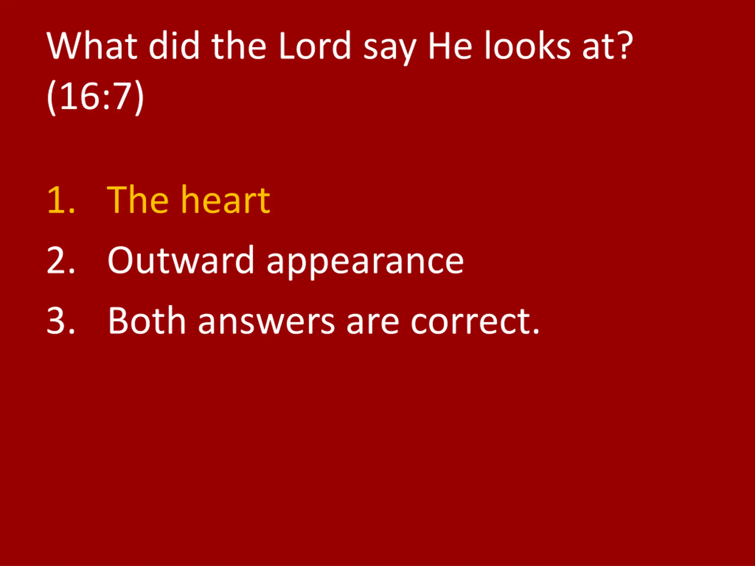 What did the Lord say He looks at? (16:7) 1. The heart 2. Outward appearance 3. Both answers are correct.